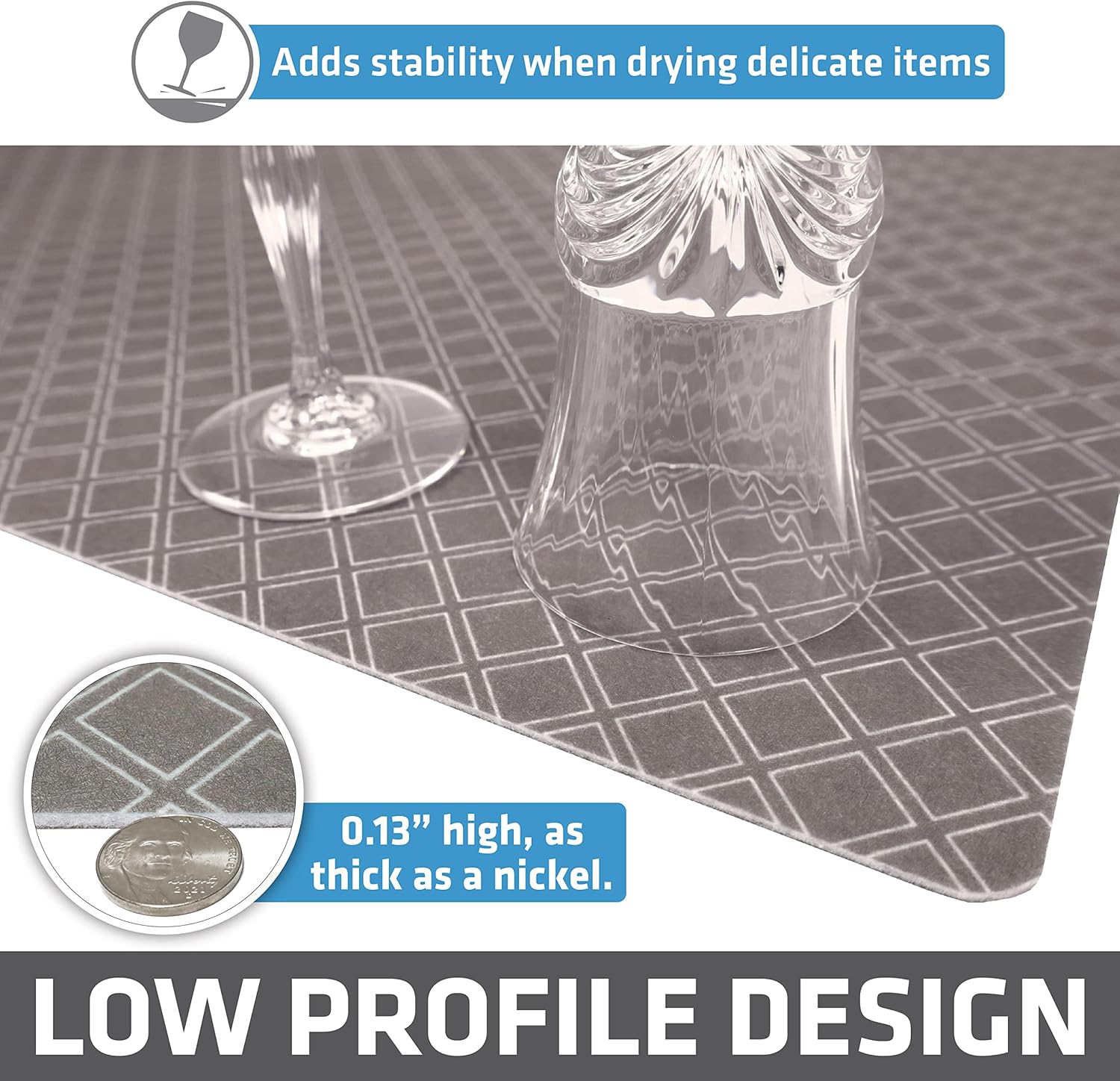 - (XL SIZE) KEEPS COUNTERTOPS CLEAN AND DRY (PREMIUM LOW-PROFILE DESIGN): The low-profile design (0.13” thick), adds stability when drying stemware or other delicate items and allows moisture to evaporate quickly. The XL size is great for air-drying dishes, glasses, silverware, pots, pans, and fruits and vegetables.