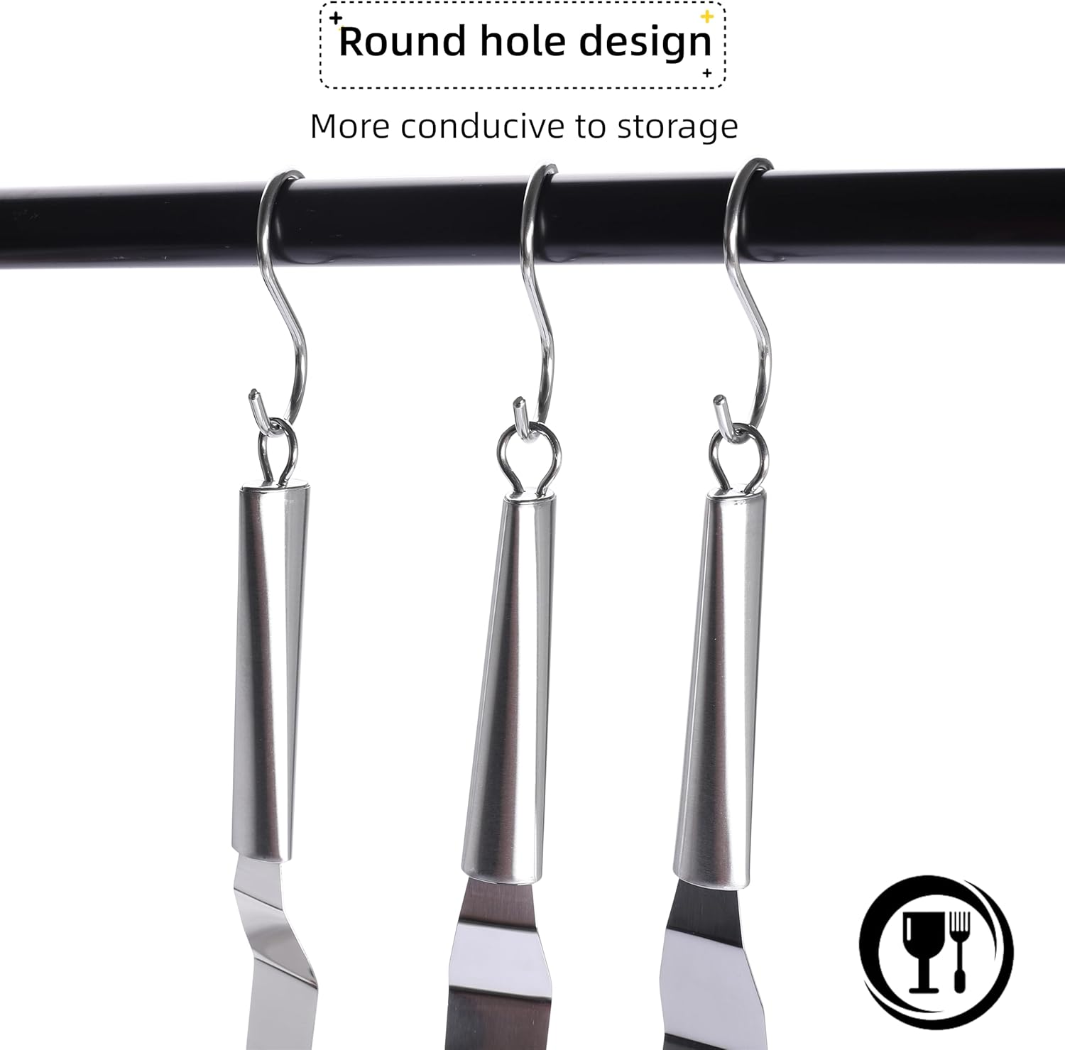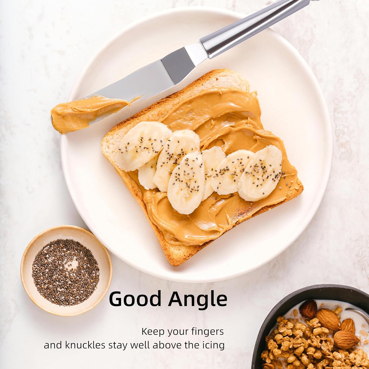 - The ergonomic Stainless steel handle with hole of angled icing spatula is lightweight and feel very comfortable to grip in your hand. The hole make it easy to hang and storage.