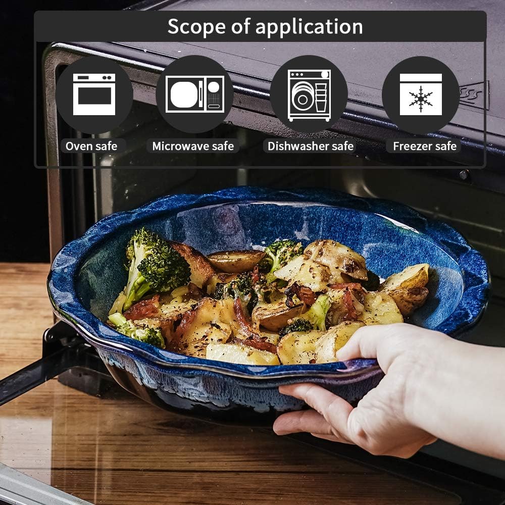- LONG LASTING COLOR AND SCRATCH RESISANT: The ceramic pie tins are made of high quality and safe glaze. Extremely hard glaze does not scratch and durable for everyday use, ideal in the kitchen for making delicious meals and desserts.