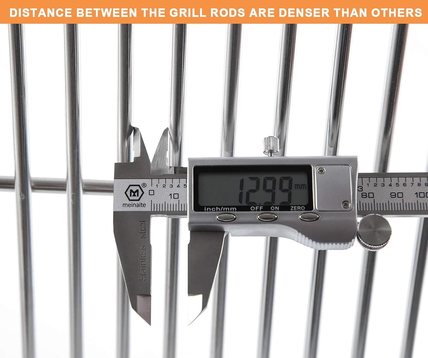 - Package includes 2-pack solid stainless steel cooking grates; Material: Heavy duty solid stainless steel: each rod diameter is 7mm( it is thicker and stronger than other traditional grill grates ). The rod of each of our grill grate is dense enough, which makes your food less likely to fall off during grilling. High quality stainless steel material, strong and durable, not easy to rust and evenly heated.