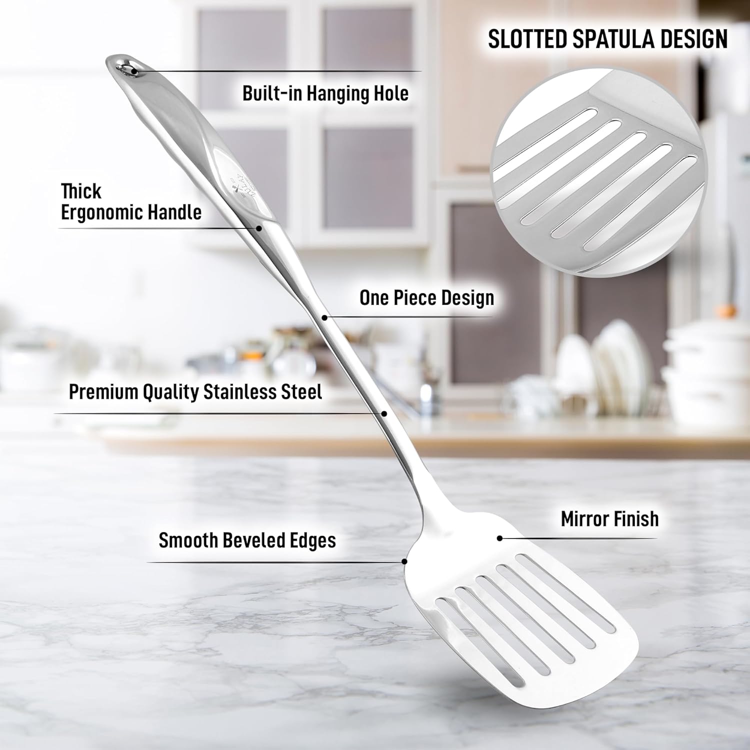 - ERGONOMIC EASY GRIP HANDLE: This stainless steel slotted turner is stylish, sturdy, and was built with a convenient length of 14.8 inches that is engineered to prevent oil splash when pan-frying or avoiding heat when grilling. Durable steel design does not bend at all when turning or lifting heavier foods. The slotted head is ideal for stir-frying or grilling as the oil or butter easily drains through the slots. Handle is designed for comfort when cooking.
