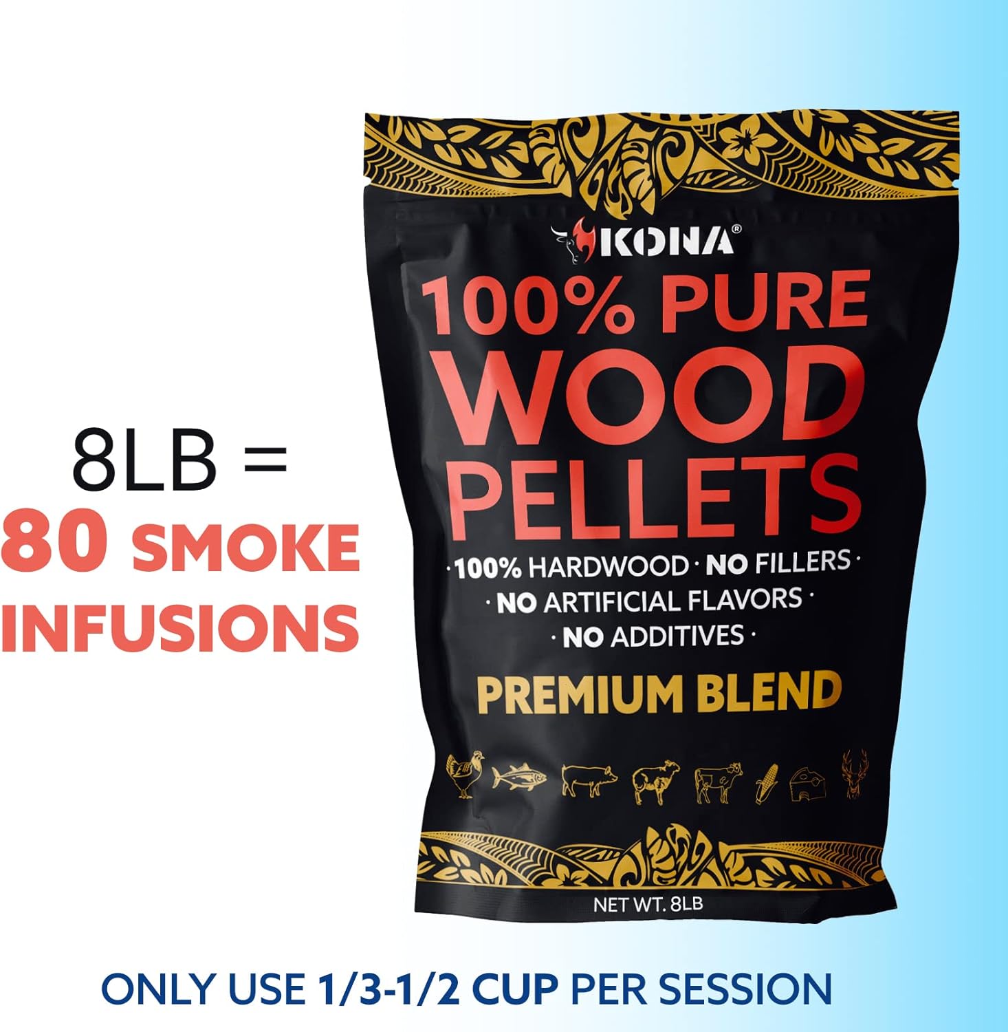- AMAZING WOOD FIRED FLAVOR - Kona best BBQ smoking pellets variety pack provides an outstanding variety of flavors for an entire grilling season (80 uses). Only 1/3 to 1/2 cup is needed per use.