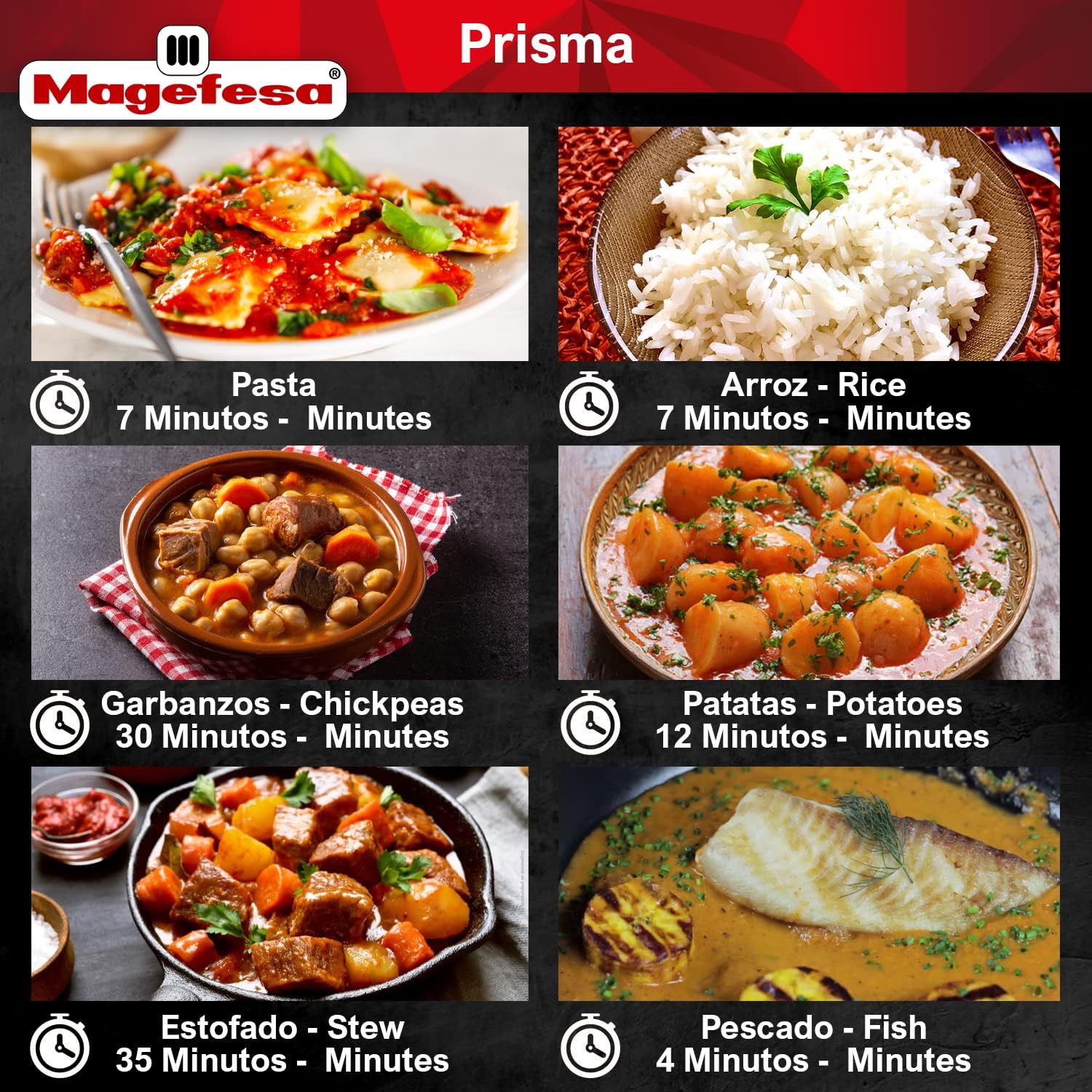 - Include: Magefesa Prisma 4.2 + 6.3 Qt stove-top pressure cooker (lid and two bodys), Quick Guide, User's Manual, Recipe times list and 2 year of warranty with Magefesa, the most important brand of pressure cookers in Spain.