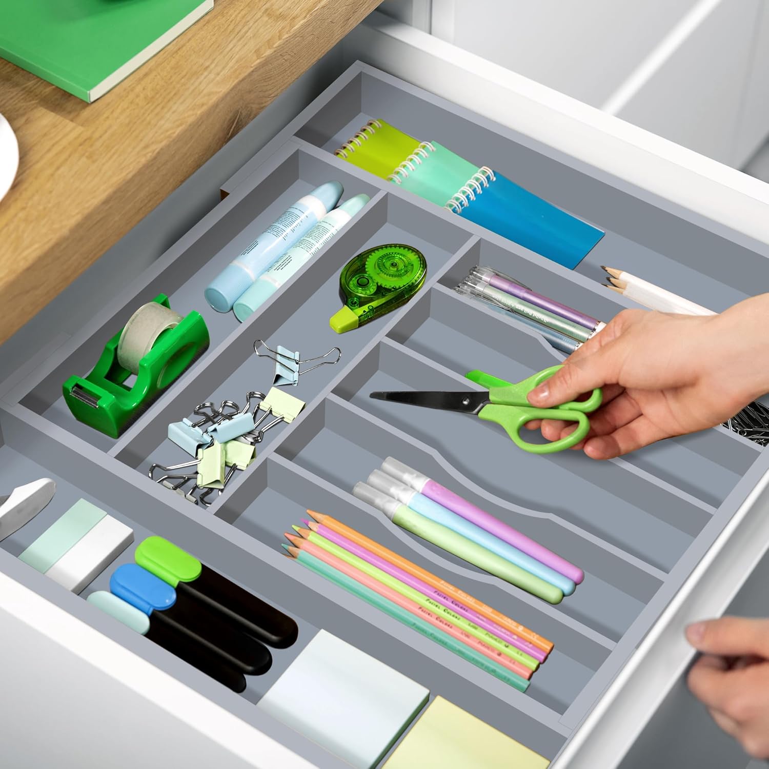 - ππππππ-πππππππ πππ: Not only is this the perfect solution for keeping your kitchen drawers spic & span, but this organizational tool is extremely versatile, suitable for placement in your office, dresser, makeup drawer, & crafting corner. Easily keep office supplies such as pencils, pens, markers, post-its, paper clips & more together in one place, and easy to grab. Neatly arrange jewelry, make-up brushes, or even paints, paintbrushes, and other art supplies, an all in one organizing solution