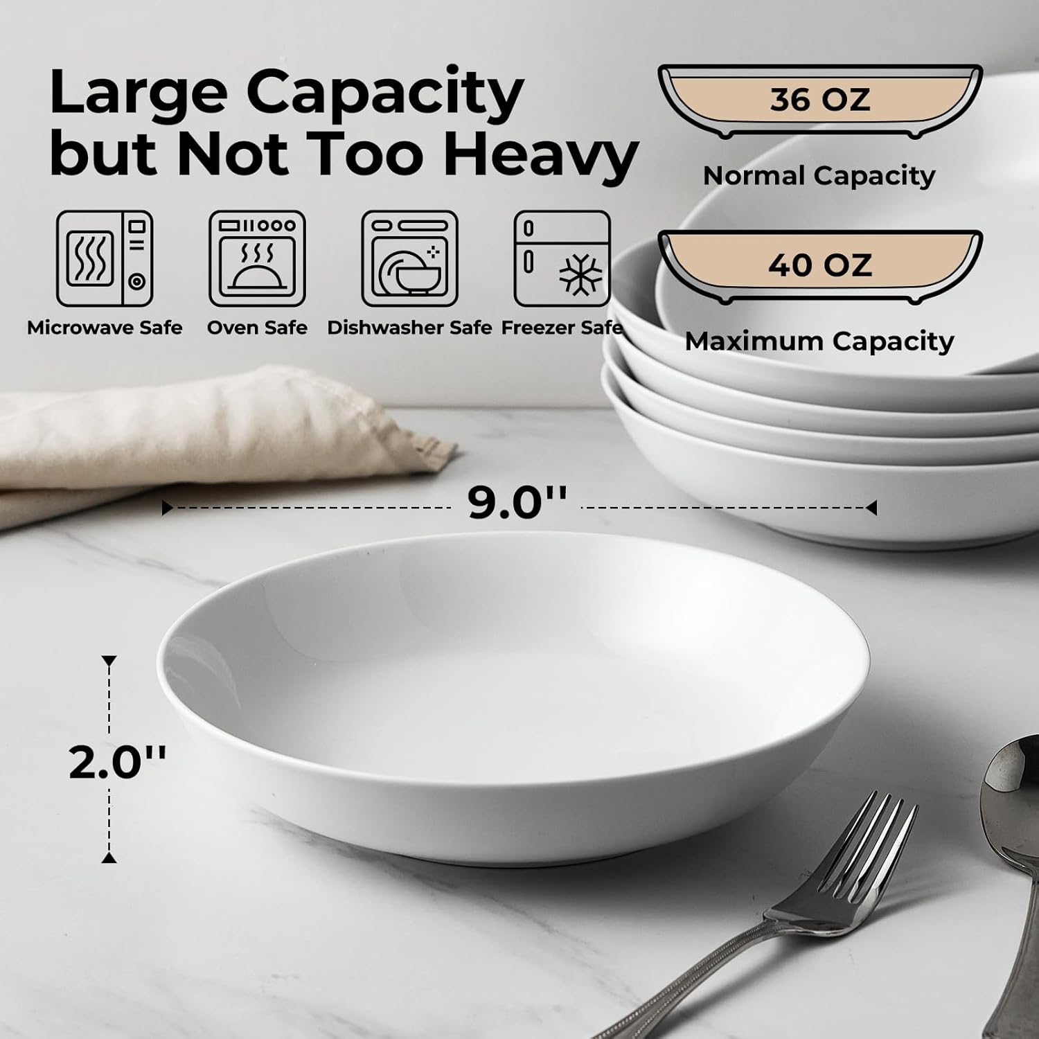 Y YHY 9" Pasta Bowls, 40oz Large Salad Bowls Set of 6, Wide Shallow Ceramic Bowls for Serving Soup, White Dinner Plates Set for Kitchen, Microwave Dishwasher Safe