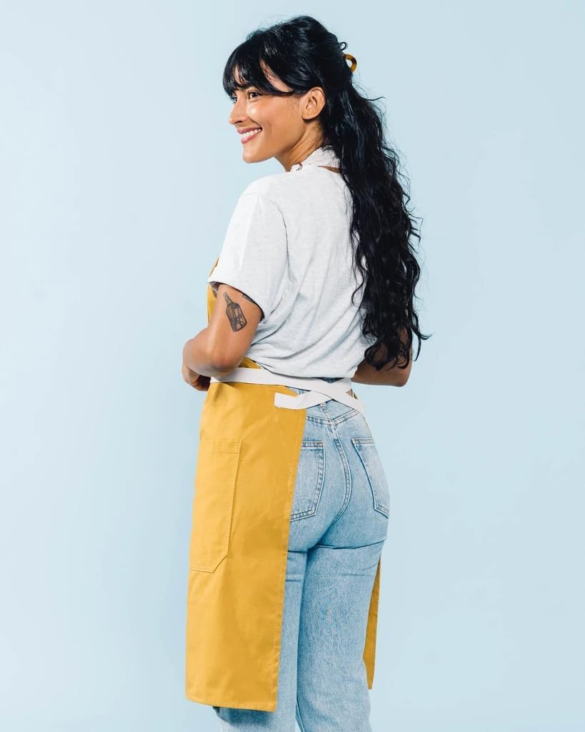 - STAY STAIN-FREE: Don't ruin your favorite clothes in the kitchen -- keep clean with this protective bib apron (that goes perfectly with your stylish knife set and kitchen towels).