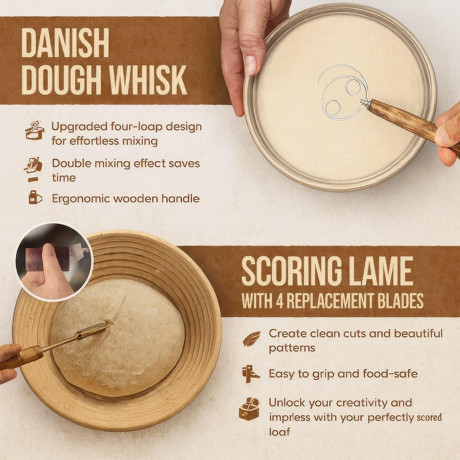 - CRUSTS THAT DAZZLE, FLAVORS THAT WOW – Made from premium natural rattan, our bread proofing basket helps your dough achieve that professional-grade crust. Pair it with our included sourdough baking supplies to make loaves that look and taste incredible Our Sourdough essentials kit includes Round 9-inch and Oval10-inch Proofing Baskets, Dough Whisk, Bread Lame with Blades, Brush, Flour Duster, Plastic Bowl Scraper, Metal Dough Scraper, Bannton Liner, Bread Stencils, Silicon Baking Mat, and Recipe Book. "
