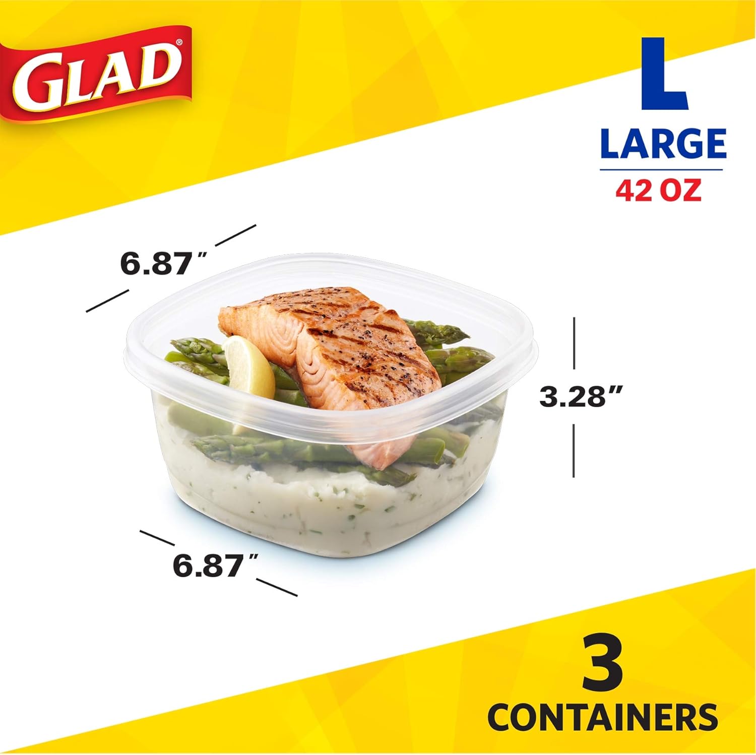 - THE RIGHT SIZE FOR EVERYTHING – GladWare comes in many shapes and sizes to suit your needs. The Large Square food container can hold 42 ounces of food, making it perfect for an entrée size taco salad or grilled chicken and veggies