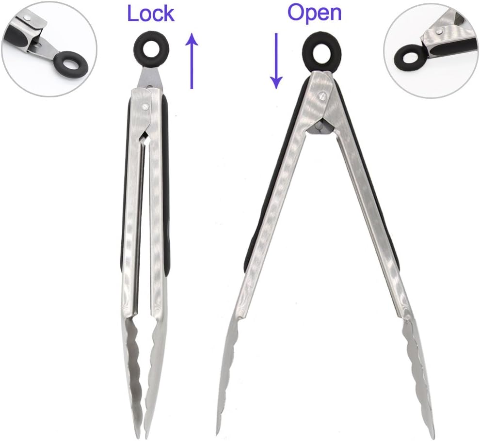 304 Stainless Steel Kitchen Cooking Tongs, 12" and 14" Set of 2 Sturdy Grilling Barbeque Brushed Locking Food Tongs with Ergonomic Grip, Black