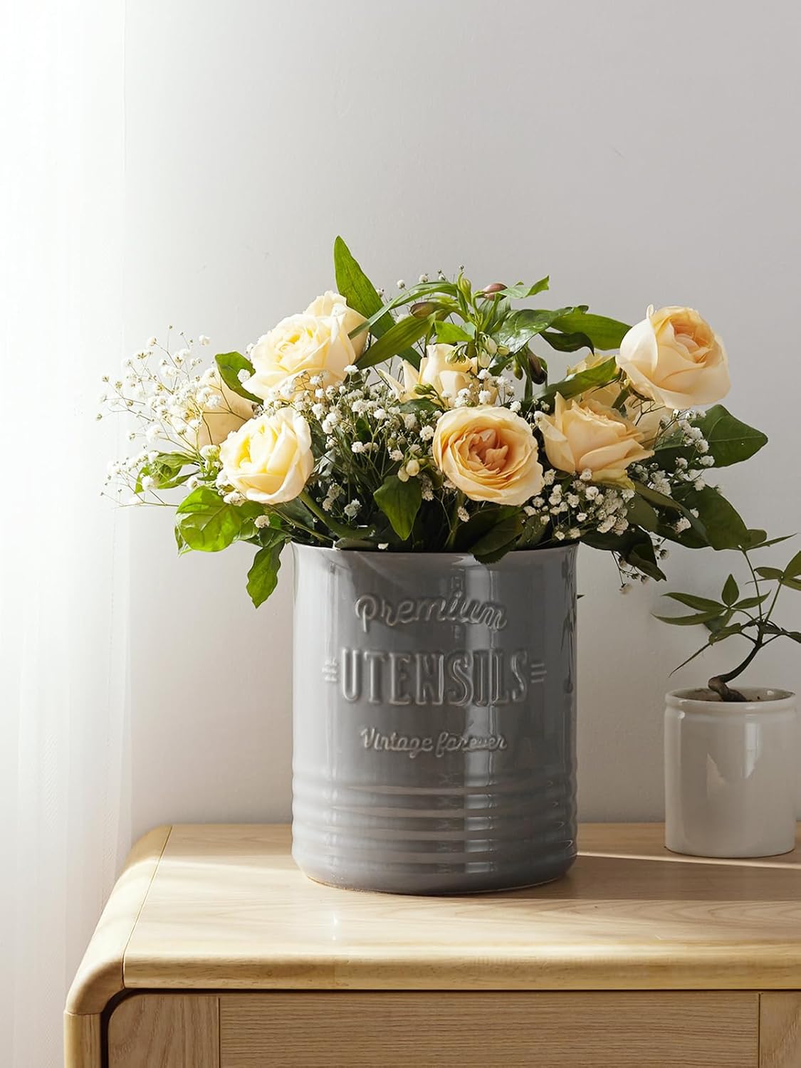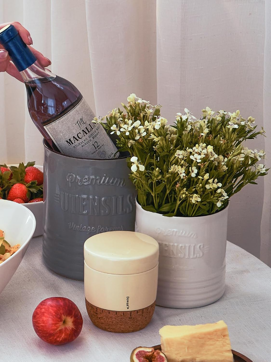 - Industrial Style Kitchen Decor. Add a unique touch to your home decor with this stylish farmhouse utensil holder. This rustic white utensil jar mathches household style and make a beautiful decoration for kitchen countertops