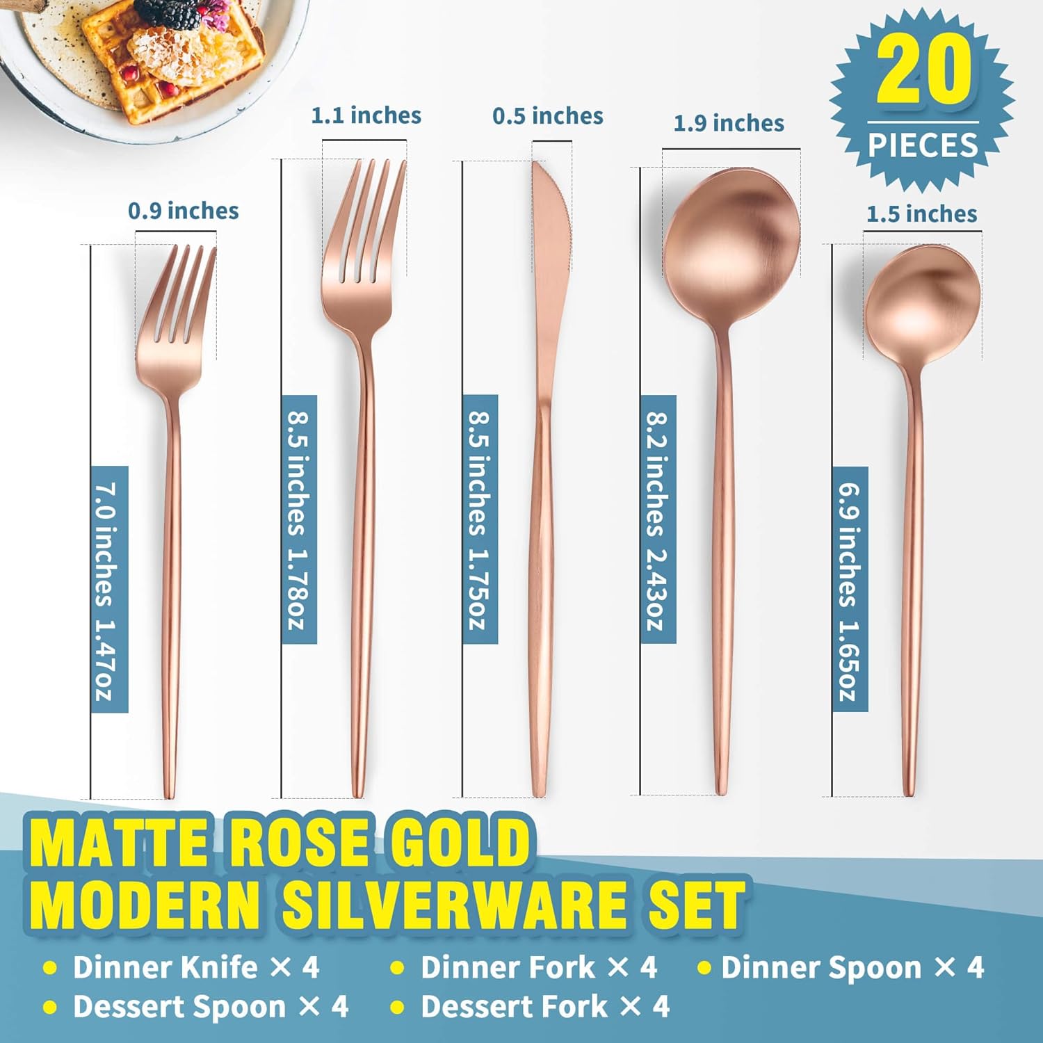 - SERVICE FOR 4 : 20 piece silverware set includes 4 dinner knives, 4 dinner forks, 4 dinner spoons, 4 dessert forks, 4 dessert spoons