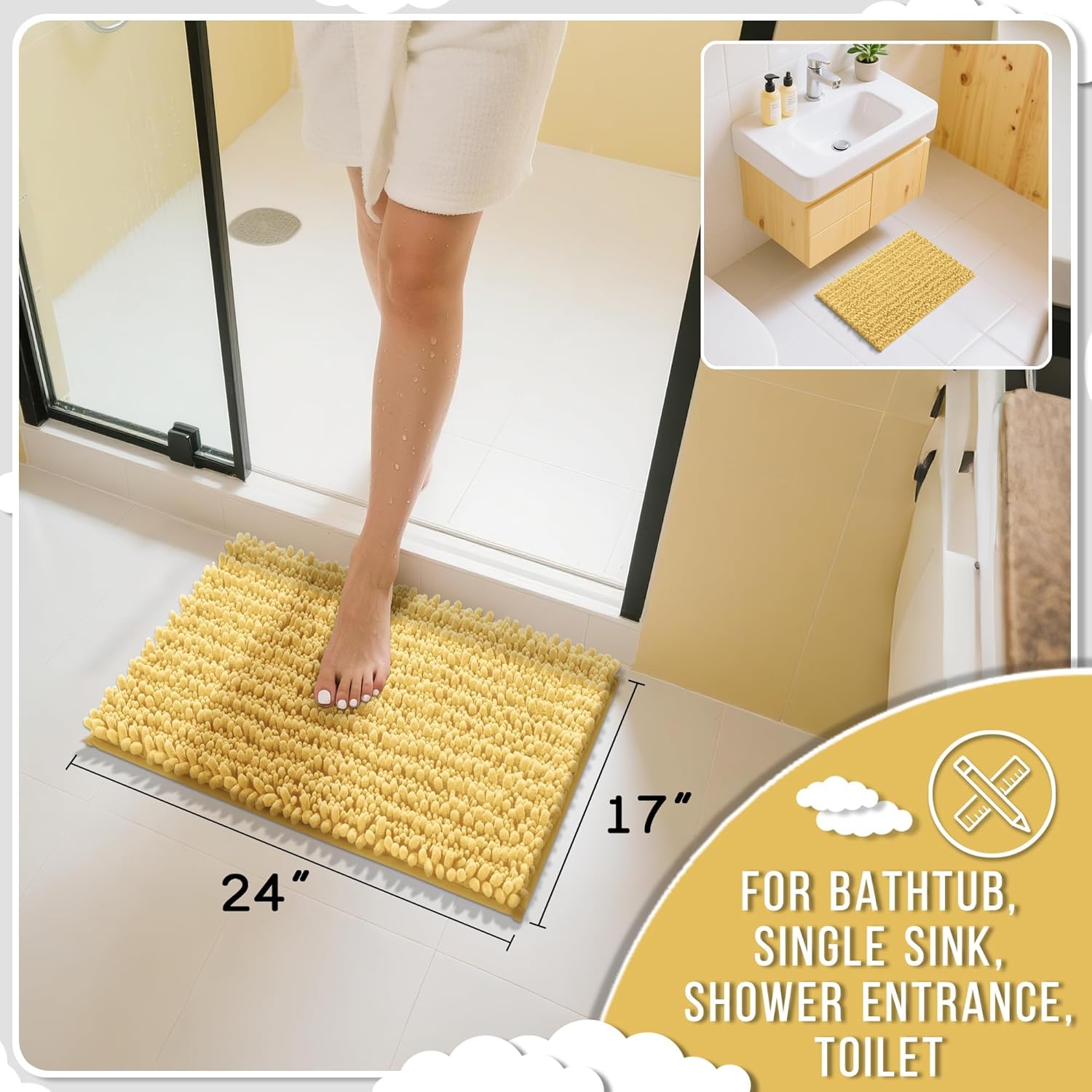 Yimobra Bathroom Rugs Non Slip Washable 24x17 Inch - Ultra Soft Absorbent Chenille Bath Mat, Quick Dry Shaggy Floor Carpet for Tub Shower, Yellow Home Decor Accessories