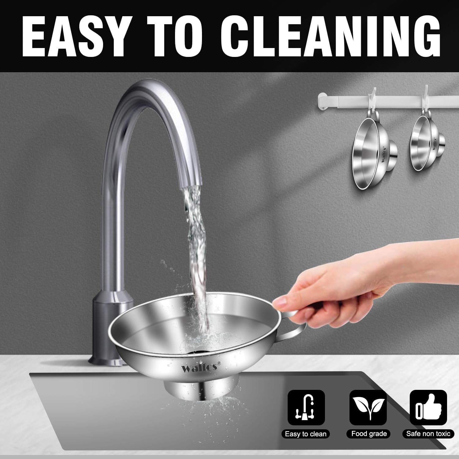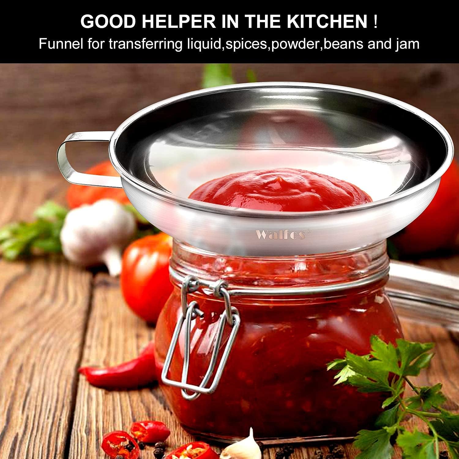 - EASY TO USE - Works great with wide mouth canning jars! Wide stem opening allows large food items to pass through easily when packaging canning jars. you can hang it in kitchen cabinets, or anywhere you can put it. Easy to clean by simply washing with soapy water after use. It was also dishwasher safe (WALFOS RECOMMEND:Please clean and dry in time after use)