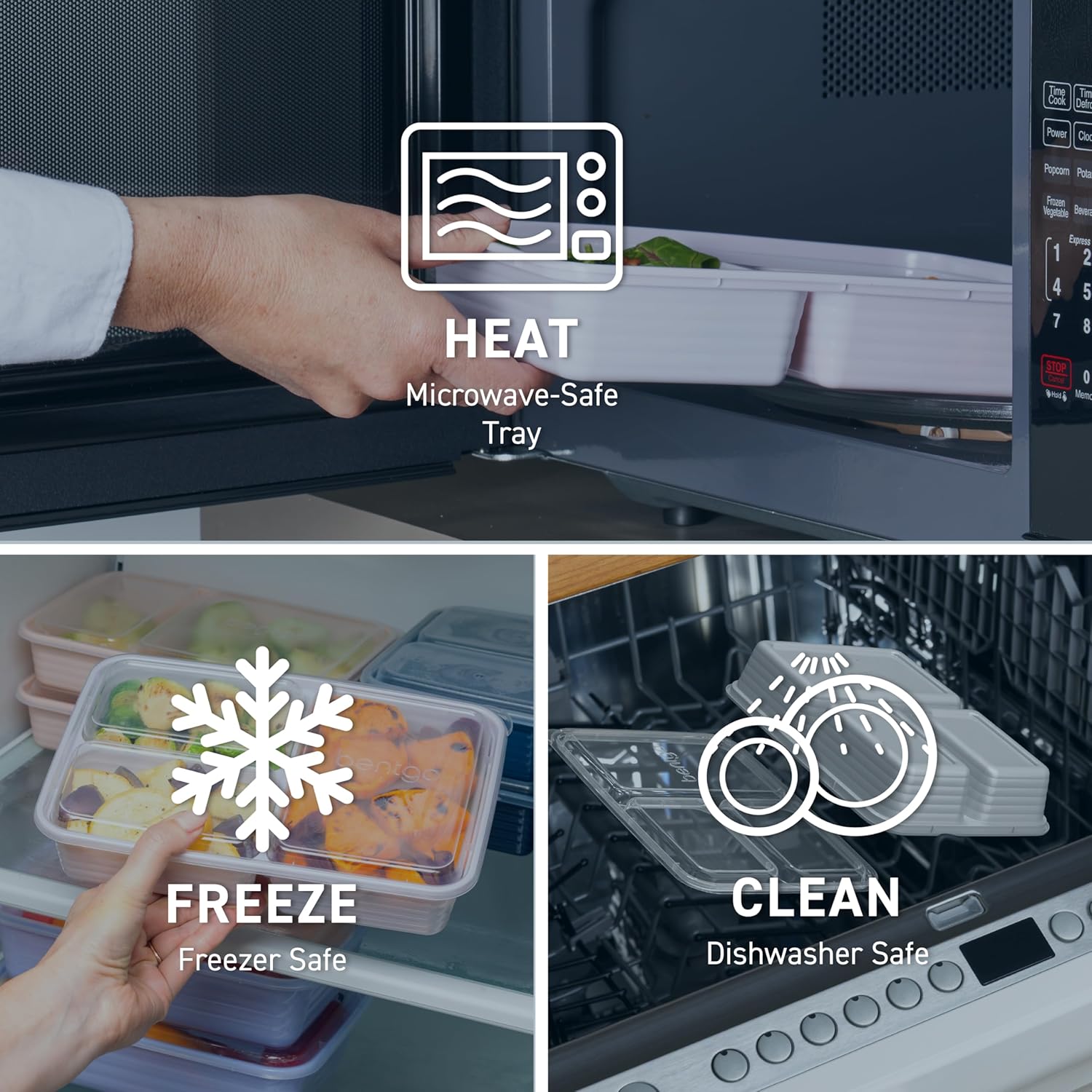 - Easy to Heat & Clean: Safely heat up your food straight from the freezer or refrigerator for warm, delicious meals and leftovers. Each meal prep container is both microwave and top-shelf dishwasher safe. Note: do not microwave lids, only the trays are microwavable. For best results, hand wash to extend the life of the product.