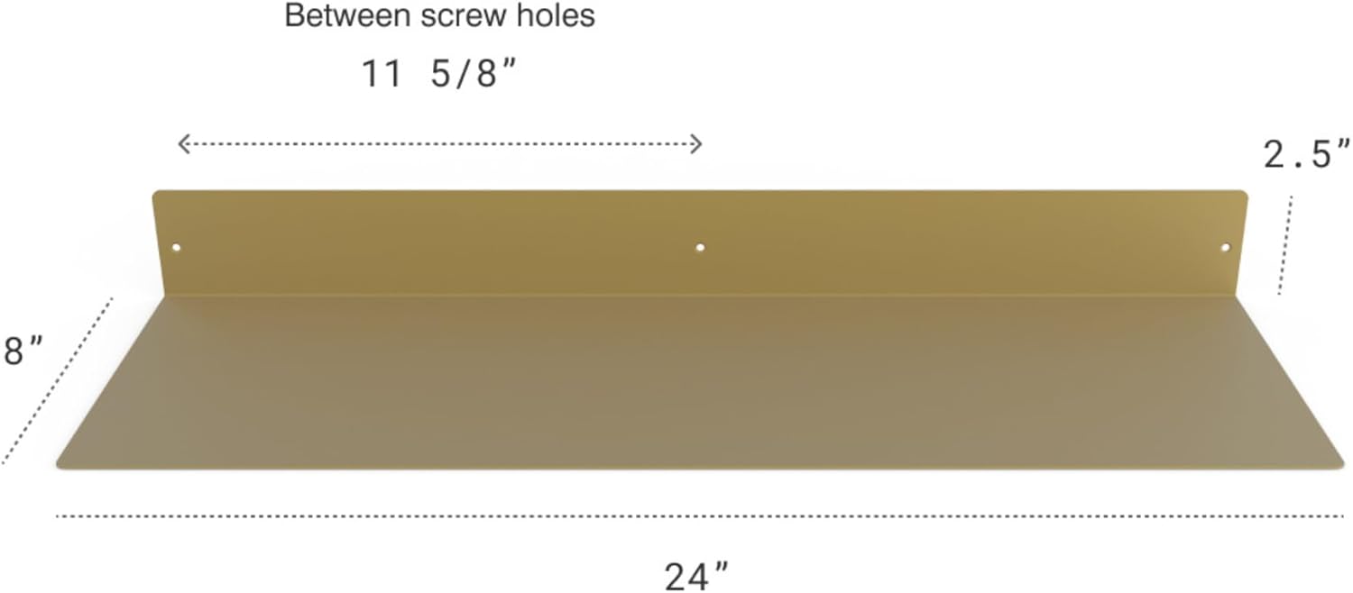 - DIMENSIONS & DETAILS: Measuring 24-inches long x 8-inches in depth, our steel floating shelf is made from 14 gauge raw steel and professionally powder coated gold. The weight of the shelf is 5 LBS. It's perfect for displaying books, plants, bottles, picture ledges, and retail displays