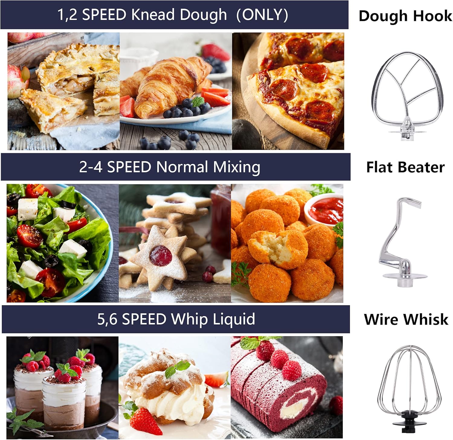 - MULTIPLE ATTACHMENTS - Stand mixer comes with 3 attachments, hook, beater and whisk to give you more choice making different food. Hook only used on 1,2 speeds for dough. Hook and beater are not Dishwasher Safe. Cleaning requiring little more than hot soapy water and sponge.