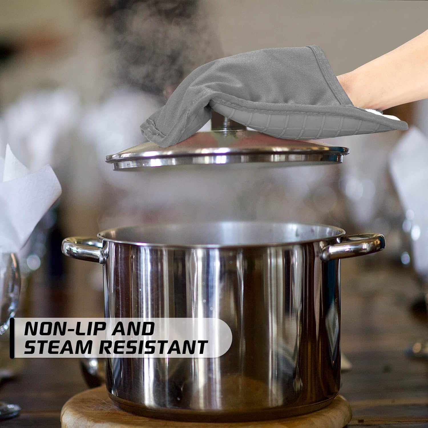 - Improved Control with Non-Slip Grip β We designed our pot holders and oven mitts with a split or divided pocket at the fingertips and a non-slip silicone pattern to give you better flexibility and control when picking up or moving kitchen items.