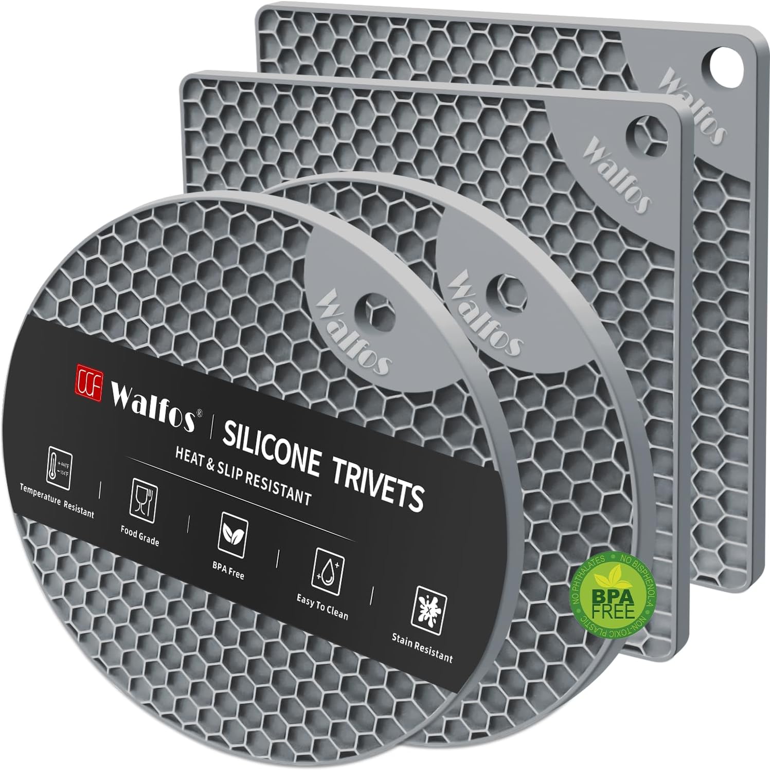 - HIGH-QUALITY SILICONE AND FOOD SAFETY: Walfos trivets for hot pots and pans are made of food grade silicone, BPA free, flexible and long-lasting. Premium silicone material ensure that they won't rust, crack or chip and it is not as heavy as metal ones