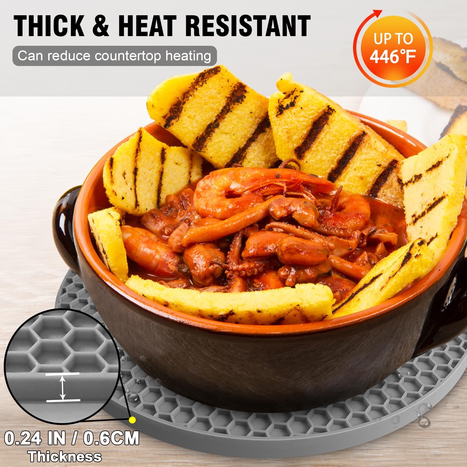 - MULTI FUNCTION: Hot Pot Holder are long-lasting and versatile also perfect for silicone mats, hot pot holders, drying mat, jar opener, spoon holder garlic peeler and coaster (Sizes: Square Trivets: 7.1" x 7.1", Round Trivets: 7" x 7". Thickness: 0.24")