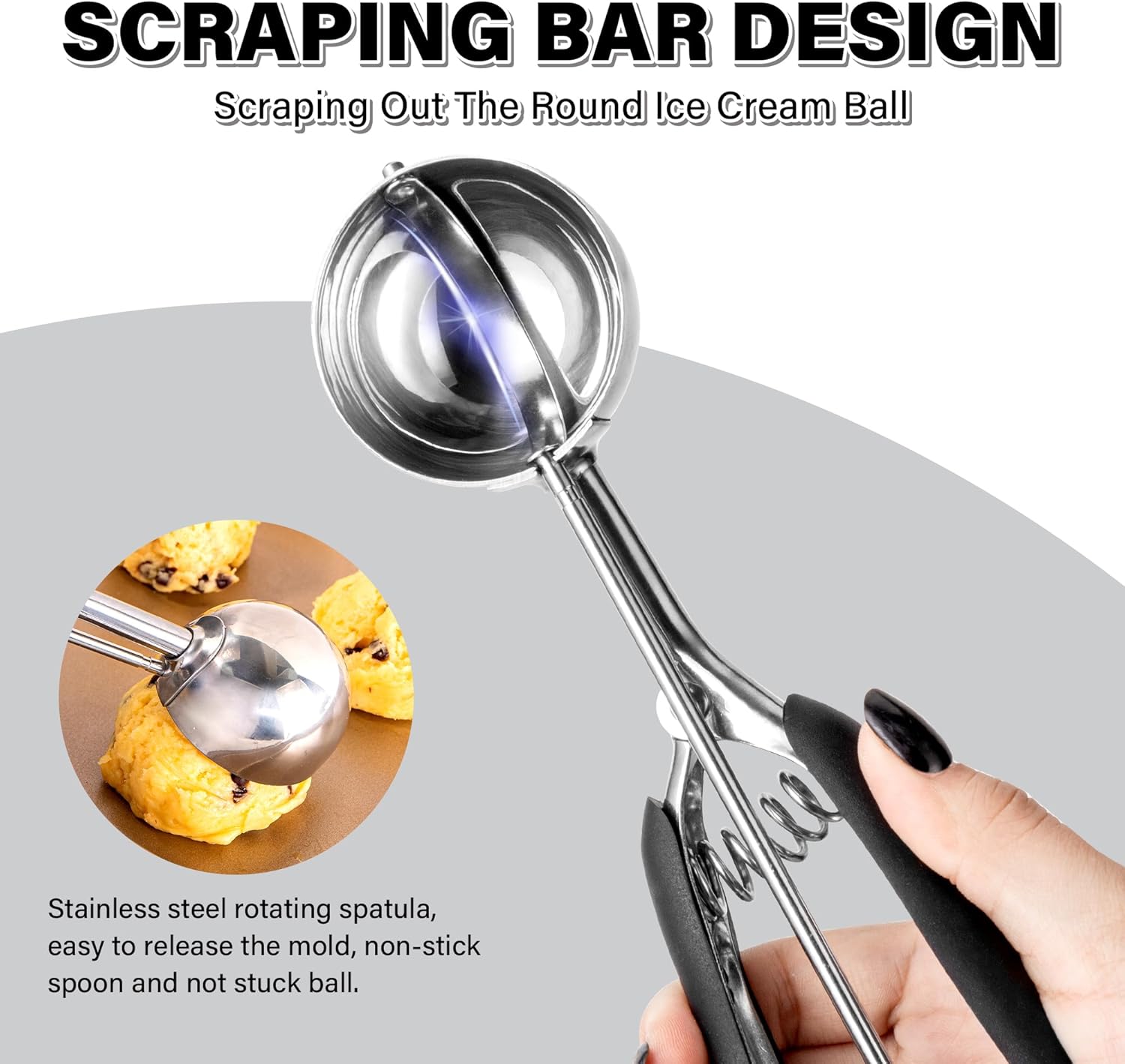 - Soft and comfortable, the heavy-duty spring-loaded handle can absorb pressure, squeeze easily, and release the cookie dough easily, making it easy to grab the cookie! The perfect shovel slides easily without effort. The grip fits both left and right hands comfortably.