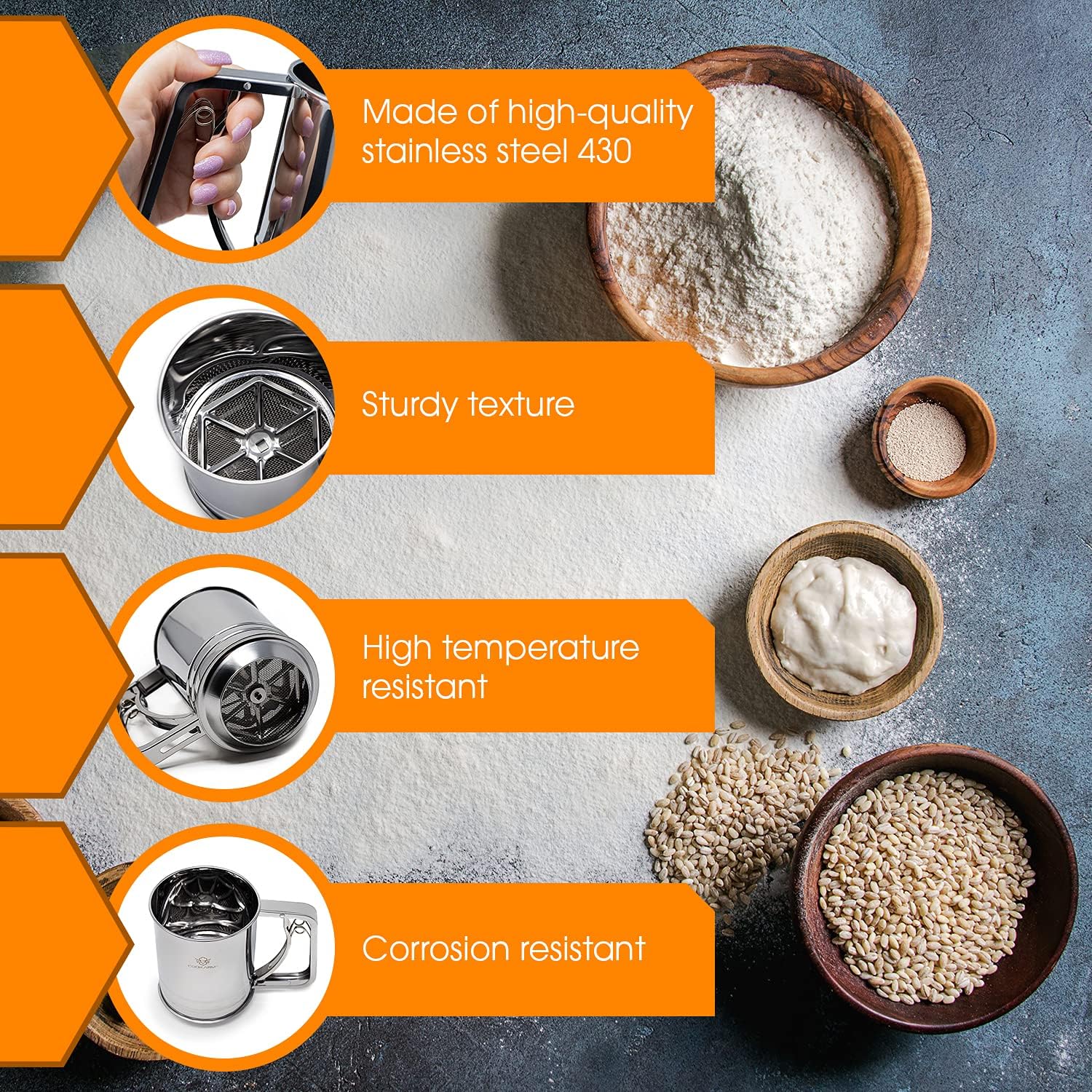 - Food Grade Stainless Steel: Our 3 cup sifter is made with rust and corrosion-resistant food-grade stainless steel to give it more durability and resilience and ensure long-lasting use in the kitchen