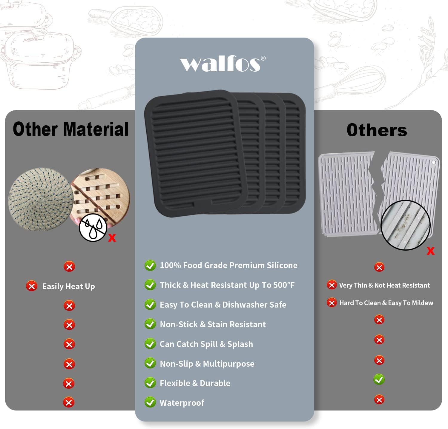 - FOOD GRADE SILICONE AND NON SLIP: Walfos trivets for hot dishes are made of food grade silicone, BPA-Free, won't absorb odor, stain, rust, crack or chip. Non-slip design of these silicone trivets make nothing slide off