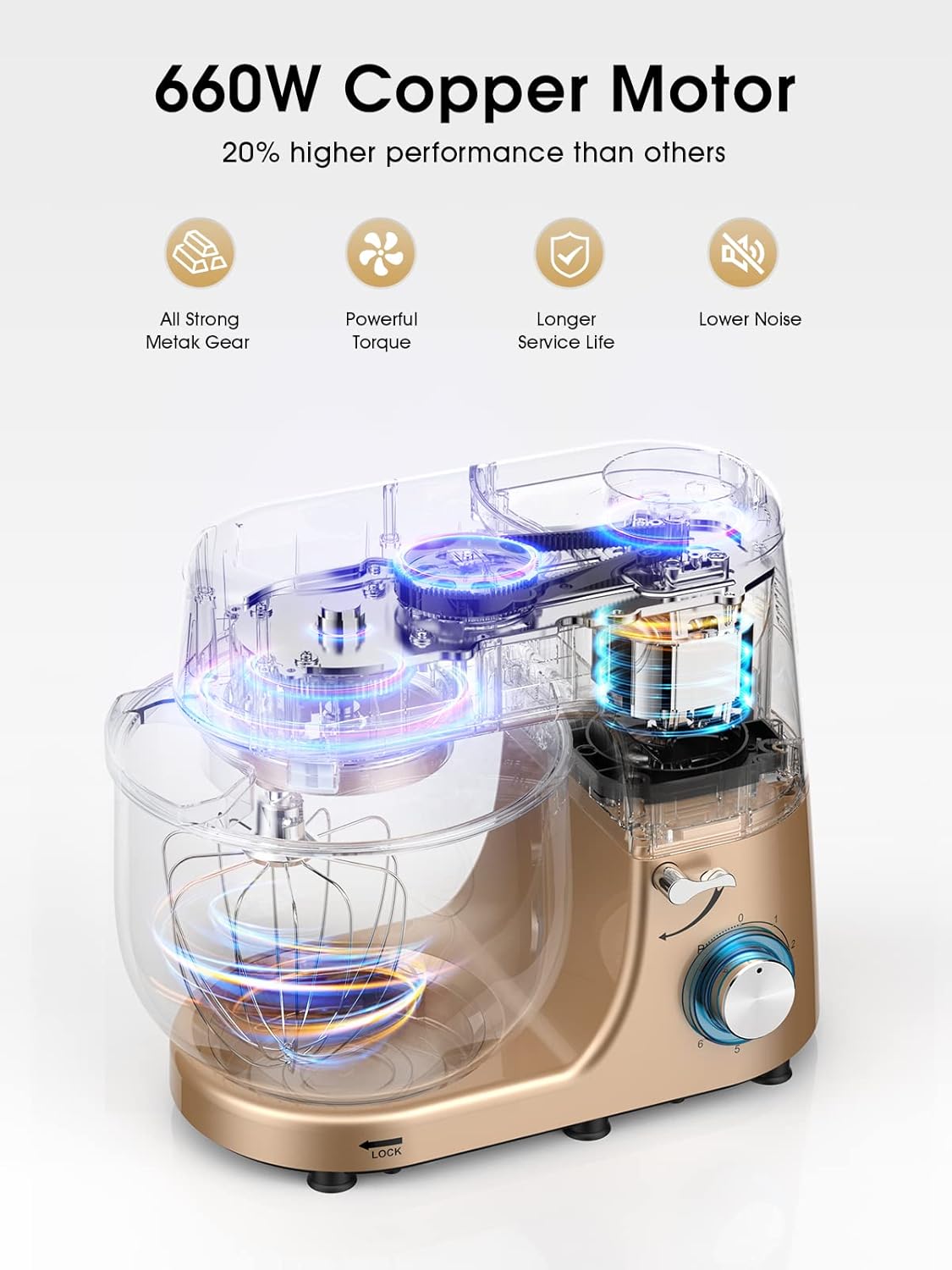 - Special Feature : Adjustable speed control, Tilt head Mixers, Smart chip controlled, Fully automatic electric stand mixer, 660W powerful high performance pure copper motor, 8.5Qt stainless steel bowl with 2 handle, 6+p speeds rotary knob with pulse function, Full metal gears + ball bearing + belt structure, LED light as power indicator, Low noise, 360° planetary mixing, Strong suction cups for more steady, Over-Heating and overload protection, Dishwasher safe, ETL certificate Adjustable speed control, Tilt head Mixers, Smart chip controlled, Fully automatic electric stand mixer, 660W powerful high performance pure copper motor, 8.5Qt stai… See more
