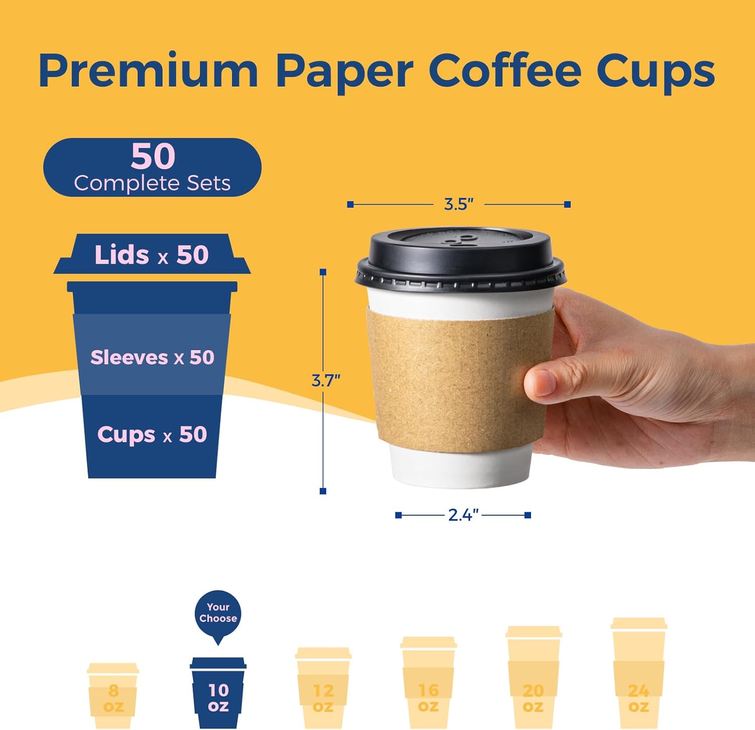 Fit Meal Prep 50 Pack 10 oz Disposable Coffee Cups with Lids, Sleeves, Leak-Proof To Go Coffee Cups with Lids, Durable Paper Cups for Hot Beverage, Home, Office, Party
