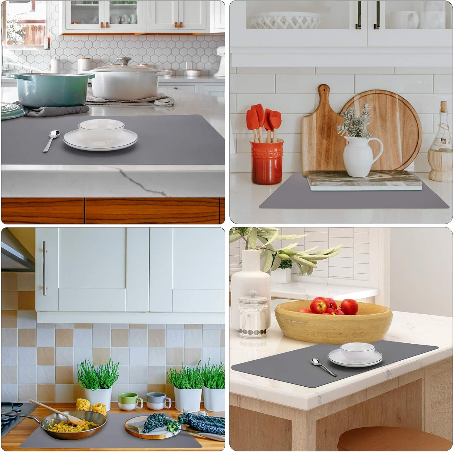 - Countertop Protector : The multipurpose silicone mat can be used as placemats, pot holder, dish mats, tableware, trivet, drains, heat insulated pads to protect the kitchen countertops and other surfaces against spills, scratches, grease, heat, etc.