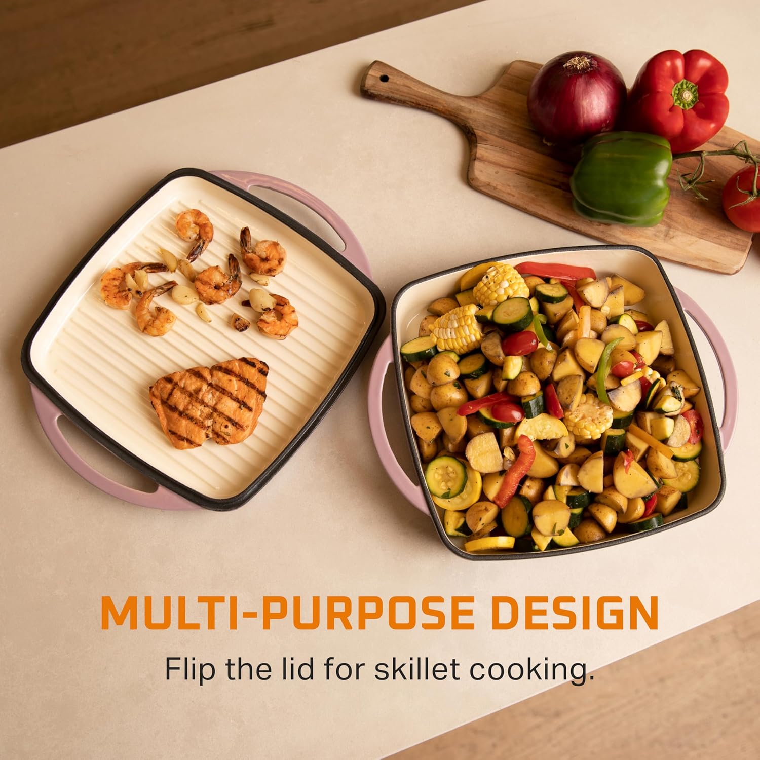 Bruntmor 2-in-1 Square Enamel Cast Iron Dutch Oven Baking Pan with Handles, Purple Baking Pans Set with Cast Iron Skillet, Braising Pan for Casserole Dish with lid, Oven Safe