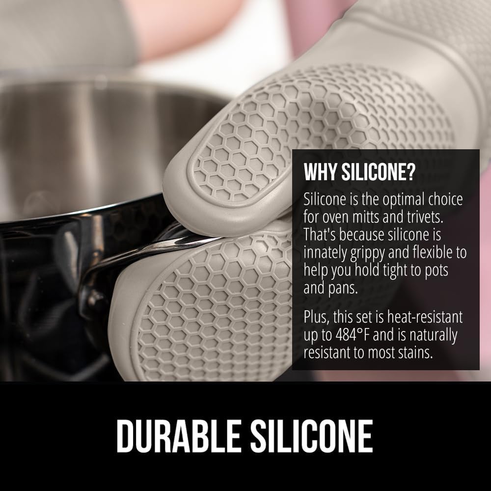 GORILLA GRIP BPA-Free Soft Silicone Oven Mitts and Pot Holders Sets of 4, Heat Resistant Waterproof Cooking Gloves, Thick Cotton Lining, Flexible Gripping for Baking Grilling, Kitchen Trivets, Almond
