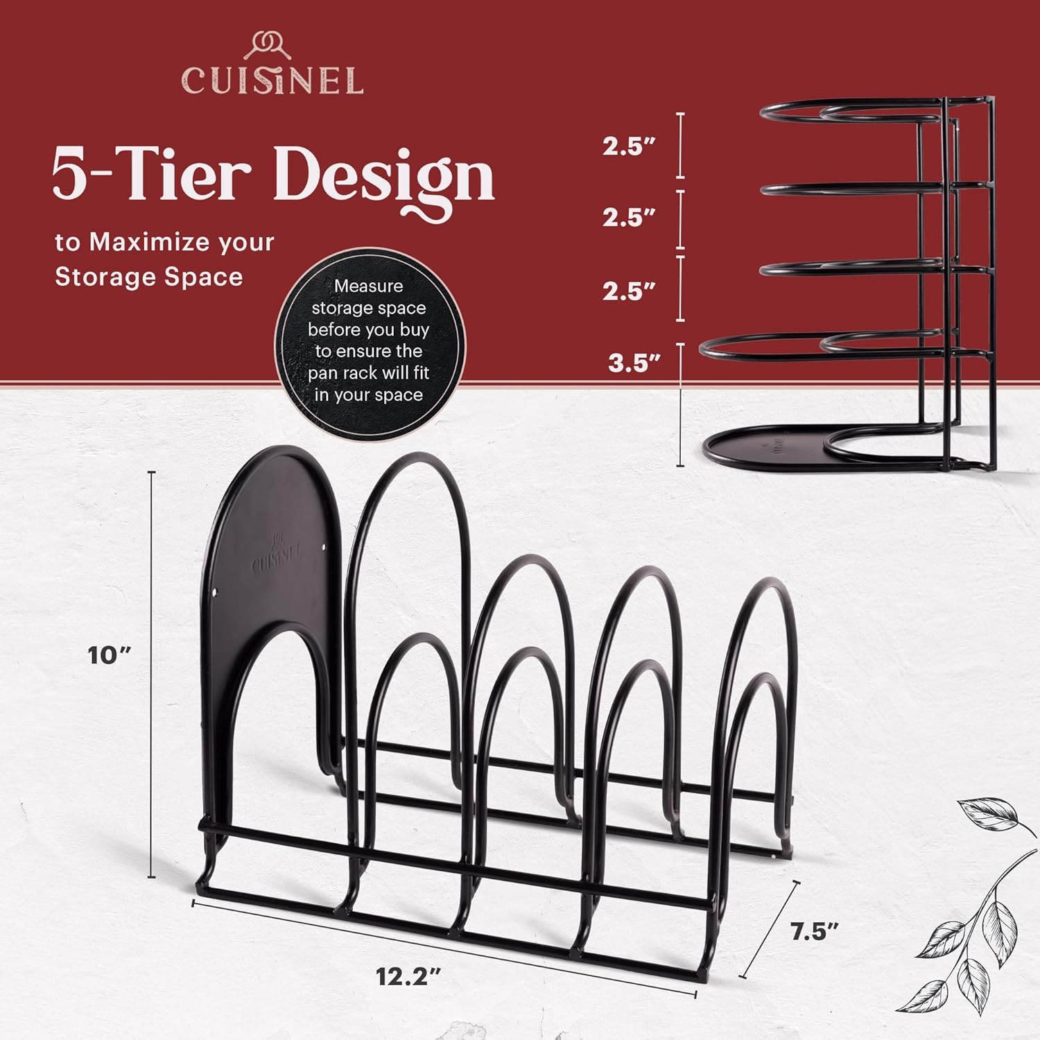 Cuisinel Pots and Pans Organizer Rack - Heavy Duty 60-LBS Capacity - 6mm Thick - Made in India - Matte-Black 12.2"-Tall 5-Tier Space-Saving Kitchen Storage for Cast Iron Cookware, Skillet, Dish, Plate