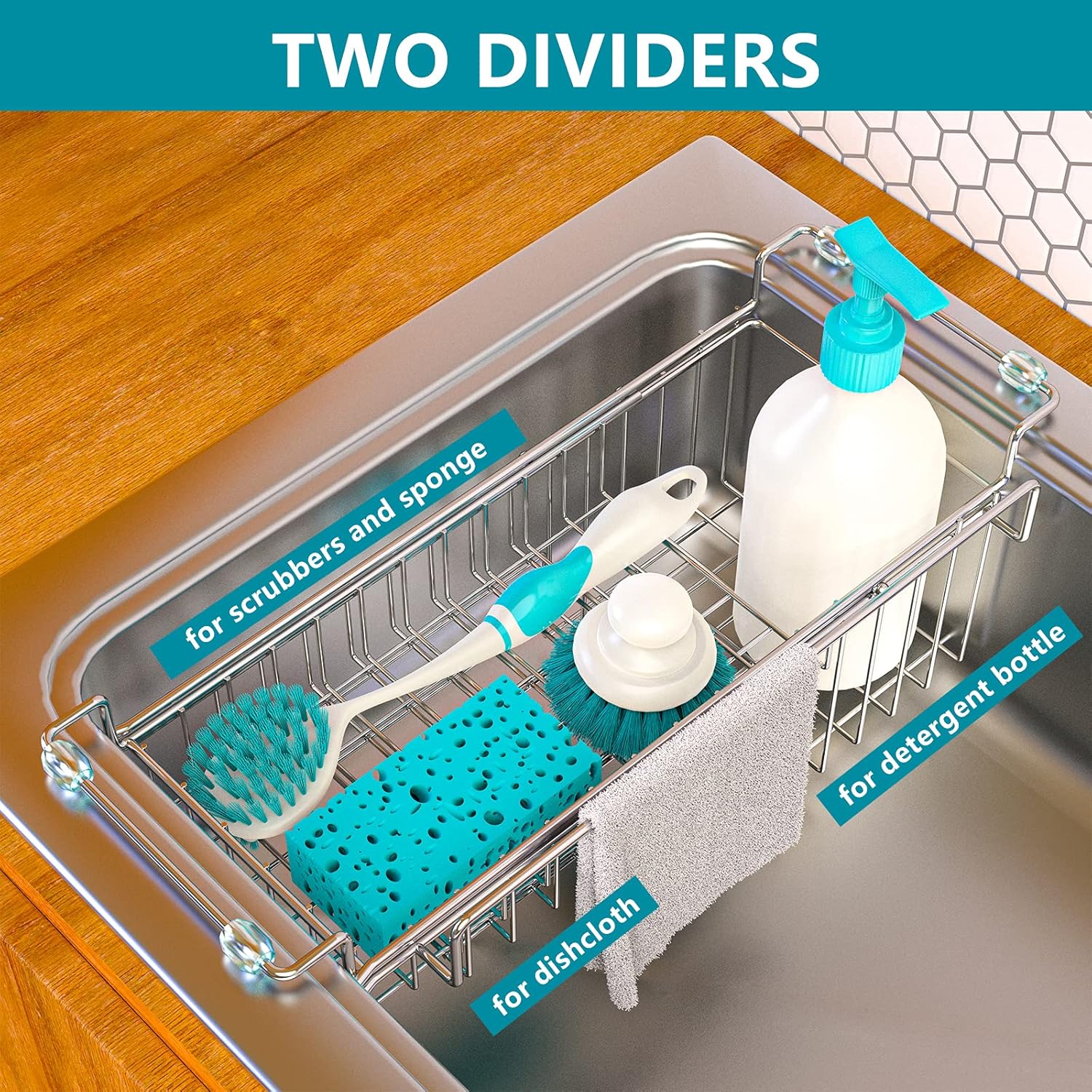 - TWO DIVIDERS - The over sink drying rack creates 2 dividers. The deeper area for soap dispenser, bottles and the shallow area for sponge, scrubbers, and brushes. Also, the is a hanging rail for dish cloth. Simply adjust the sink caddy to fit your sink and start to use. Make Sure to Check the Dimension and Measure Your Sink Before Purchase.