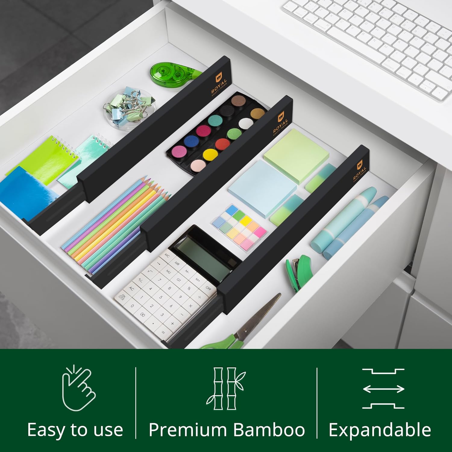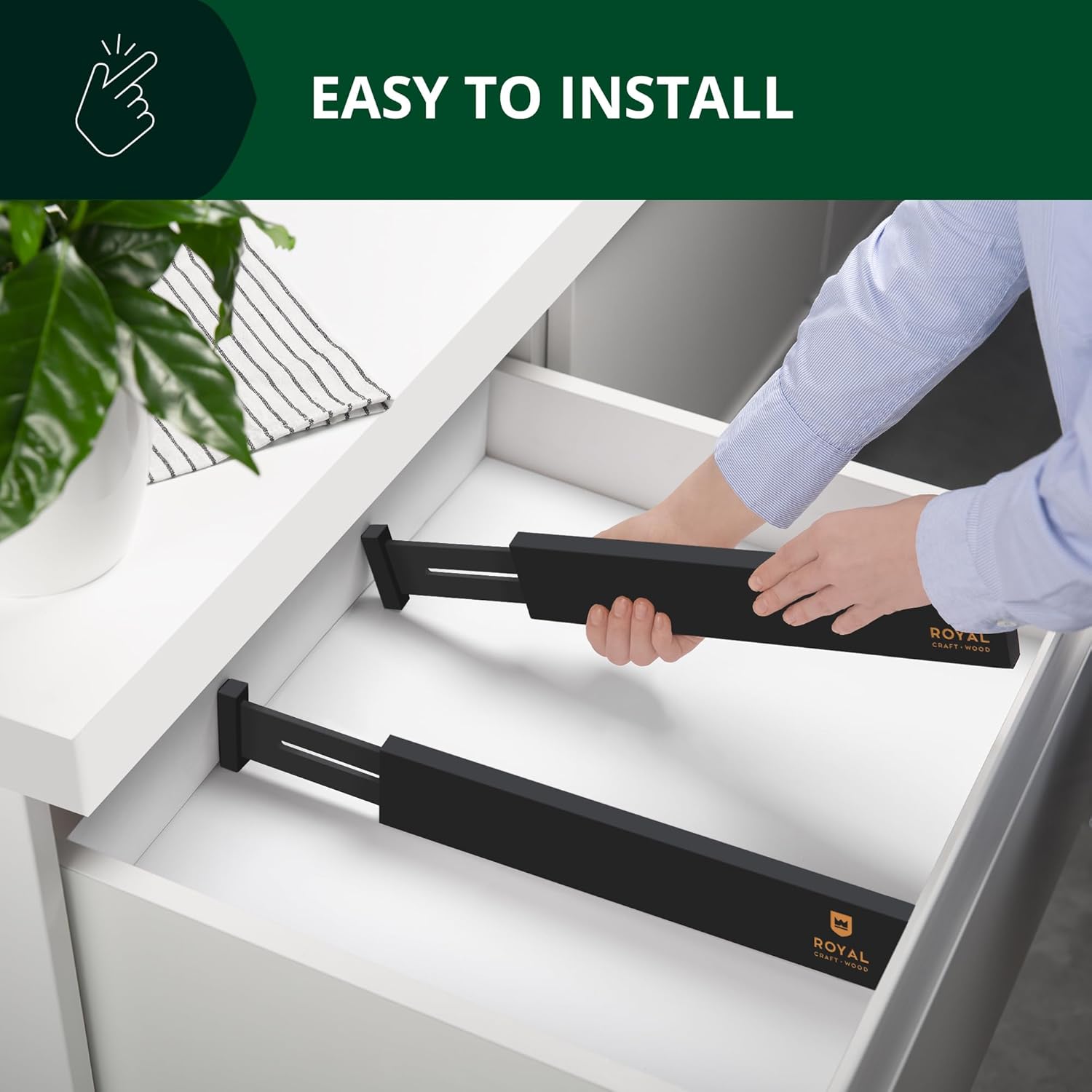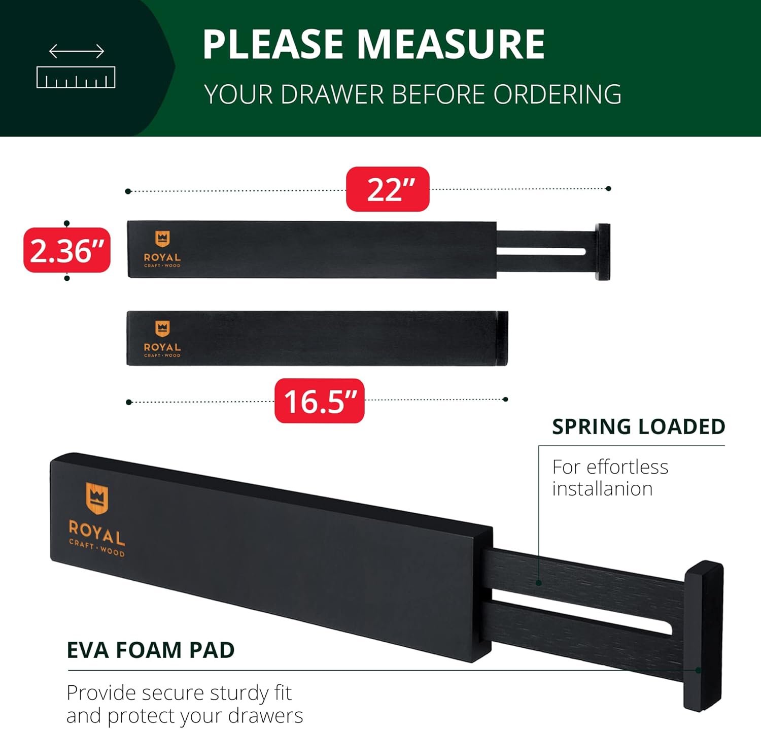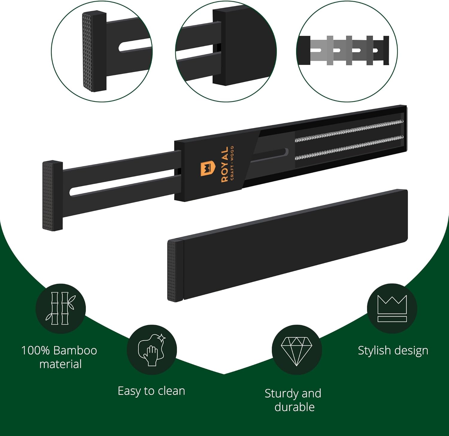 ROYAL CRAFT WOOD Adjustable Bamboo Drawer Dividers – Expandable Organizer for Kitchen, Bedroom, Bathroom, Dresser & Office – 4-Pack 17-22", Black