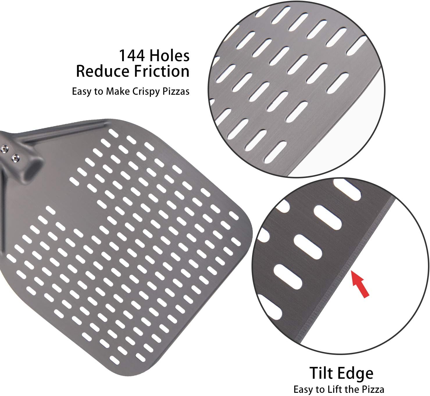 - DURABLE HARD ANODIZED ALUMINUM: 12-inch Perforated pizza peel is constructed with an lightweight hard anodised aluminium, which protect its surface from oxidation.