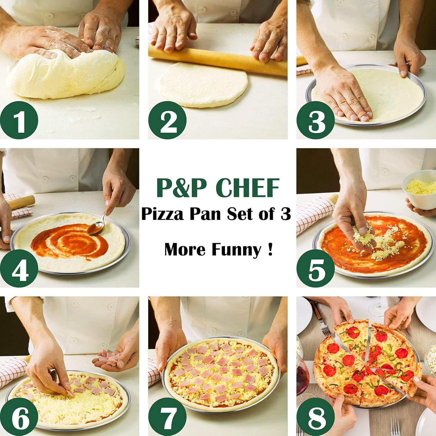 P&P CHEF 12 + 13.5 + 13.5 Inch Pizza Pan, 3 Pieces Stainless Steel Round Pizza Tray Dish Plate For Oven Baking Roasting, Healthy & Heavy Duty, Rust Free & Dishwasher Safe -Silver