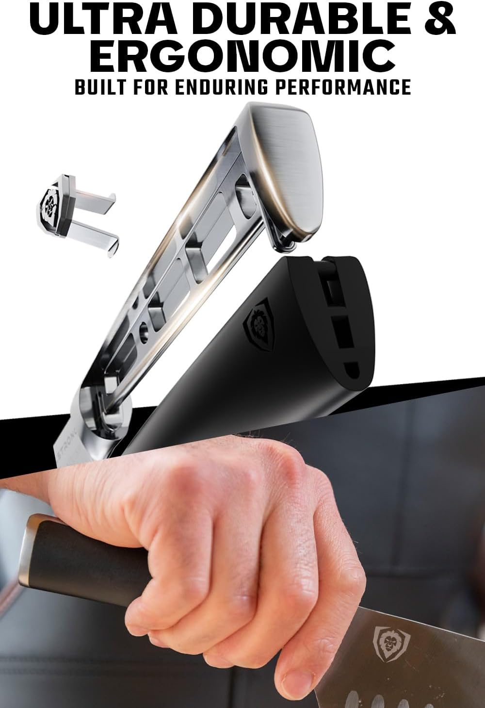 - Elegant Design and Functionality: The midnight black POM handleâhighly impervious to water and heatâensures comfort and durability. For an added touch of sophistication, the Dalstrong Lion Head pin on each handle is a reminder of the quality you can trust. With the custom-fit sheath, you can store it safely in your cupboard or take it on the go. This combination of materials and design provides both functionality and elegance, making it an essential addition to your kitchen.