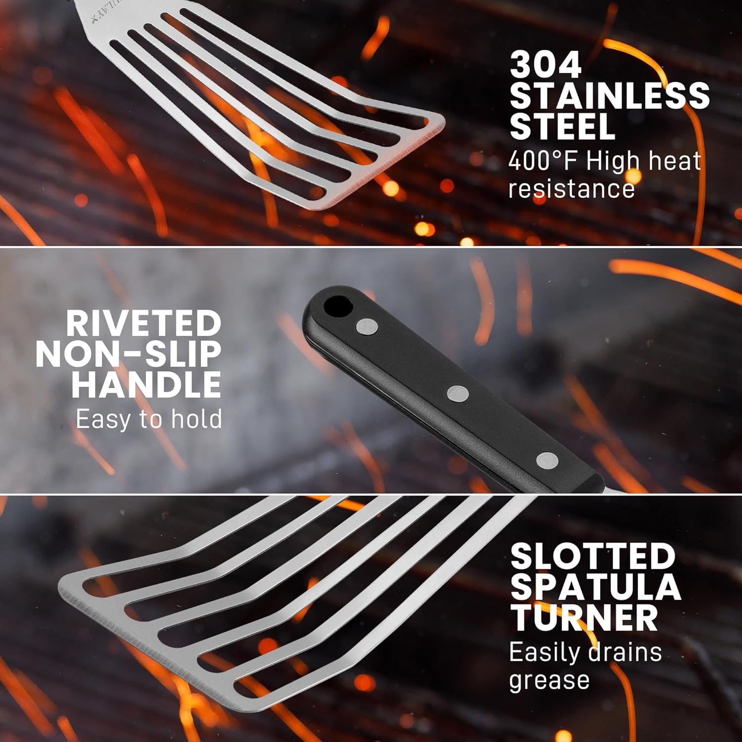 - This metal fish spatula is crafted with top-grade stainless steel, designed to withstand heat up to 400°F. Its thin, slotted design allows for precise and effortless flipping, making it perfect for delicate foods such as fish, eggs, and vegetables. The balanced construction ensures easy handling, providing excellent control when turning or lifting food.