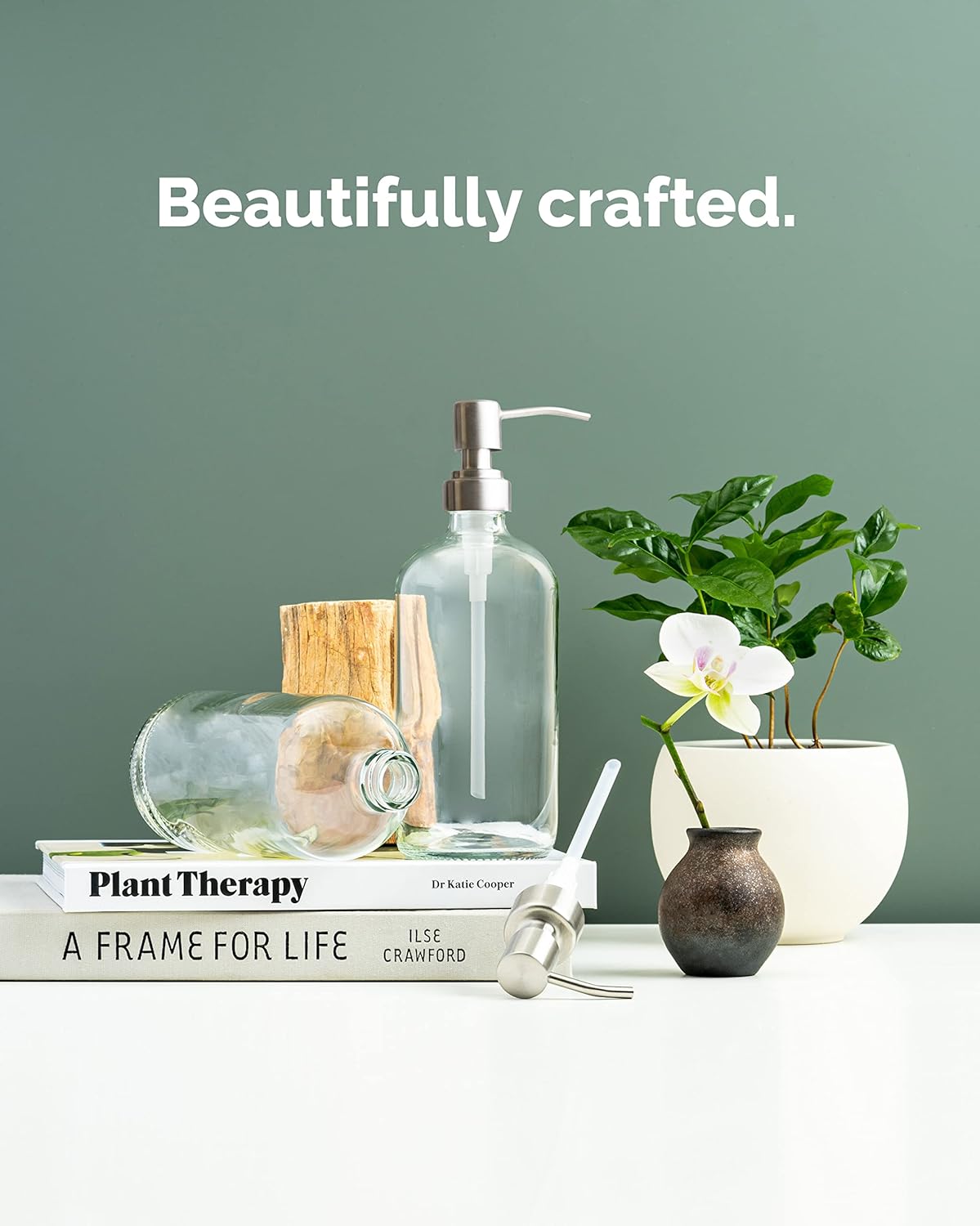 - UNRIVALED CONSTRUCTION - Set of 2 premium fortified glass soap dispenser with pump. 16 Oz shampoo dispenser, bathroom soap dispenser set for daily use. Vine Creations soap dispensers are Lead-free.