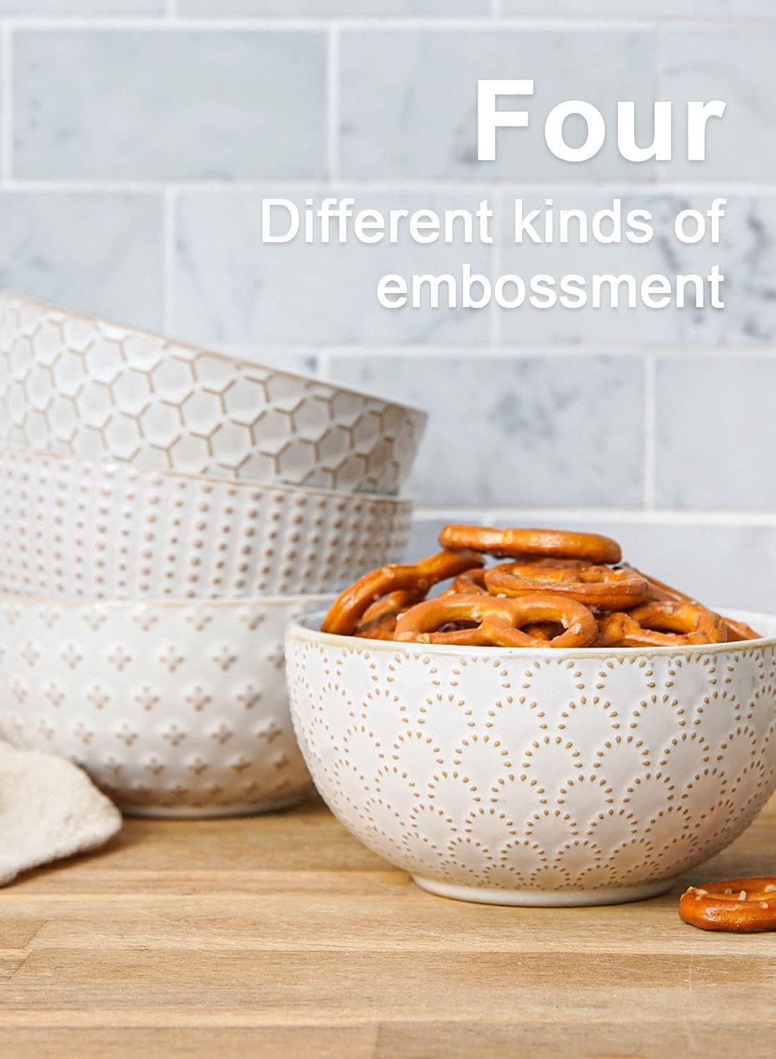 - House Warming Present Idea: Each bowl has a different pattern embossment. The outside of the bowl is embossment. The inner glaze is a smooth ceramic surface. New homeowners will like the timeless farmhouse look of these bowls