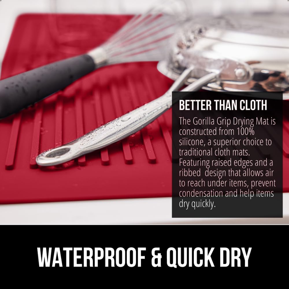 GORILLA GRIP 100% BPA-Free Patented Silicone Dish Drying Mat for Kitchen Counter, 18x16 Inch, Water Catching Ribbed Design, Easy Clean Waterproof Sink Liner, Heat Resistant, Fits Under Rack, Red