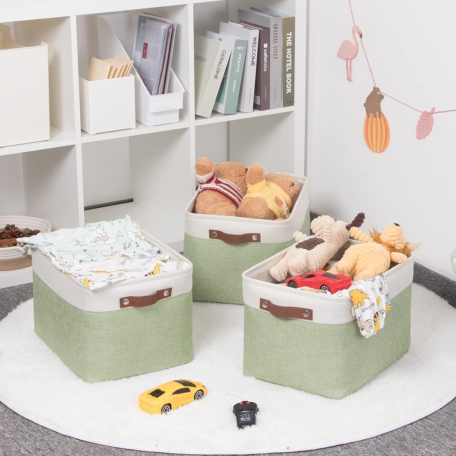 HNZIGE Storage Basket for Organizing Clothes(3 Pack) Decorative Storage Bins for Shelves Toys, Fabric Canvas Bins Storage Organizer with Handles(Gray&Green,15" X 11" X 9.5")