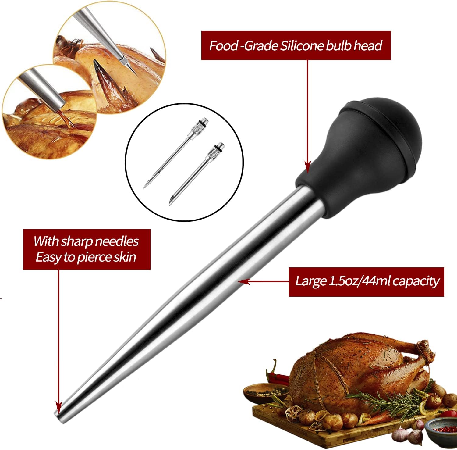 - BASTERS FOR COOKING - Our turkey baster set includes 1 pcs stainless steel turkey baster, 2 pcs baster syringe needles and 1 pcs cleaning brush,used for cooking and BBQ. Prior to baking or grilling, attach the needle included to inject and infuse flavorful juices into your roasts and cuts of meat. You also can remove the excess grease with this food baster.