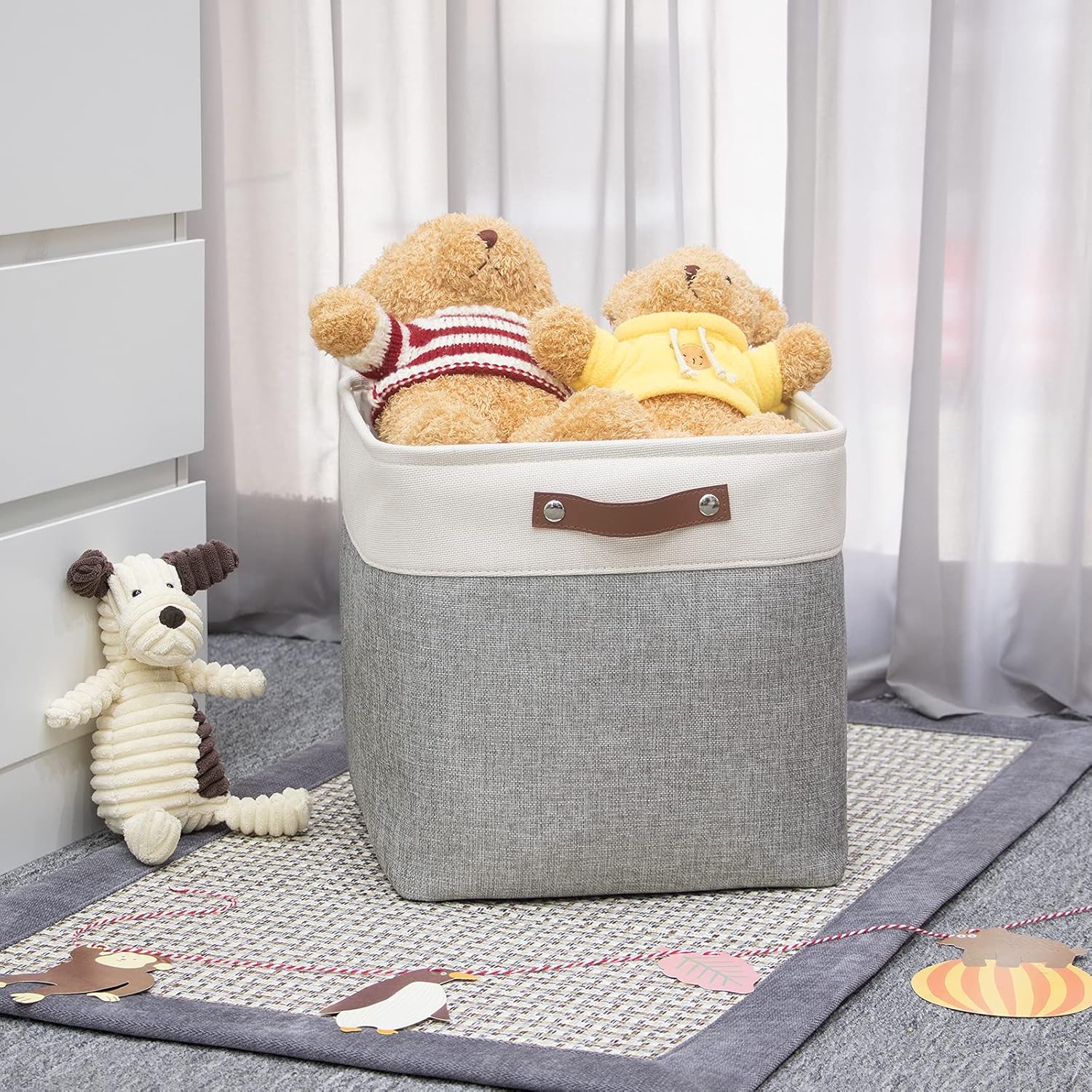 HNZIGE Storage Foldable Storage Baskets Cubes Set(3 Pack) Fabric Bins for Shelves,13 Inch Storage Basket for Organizing with Leather Handles for Home, Toys, Clothes,Closet Storage(White&Gray)