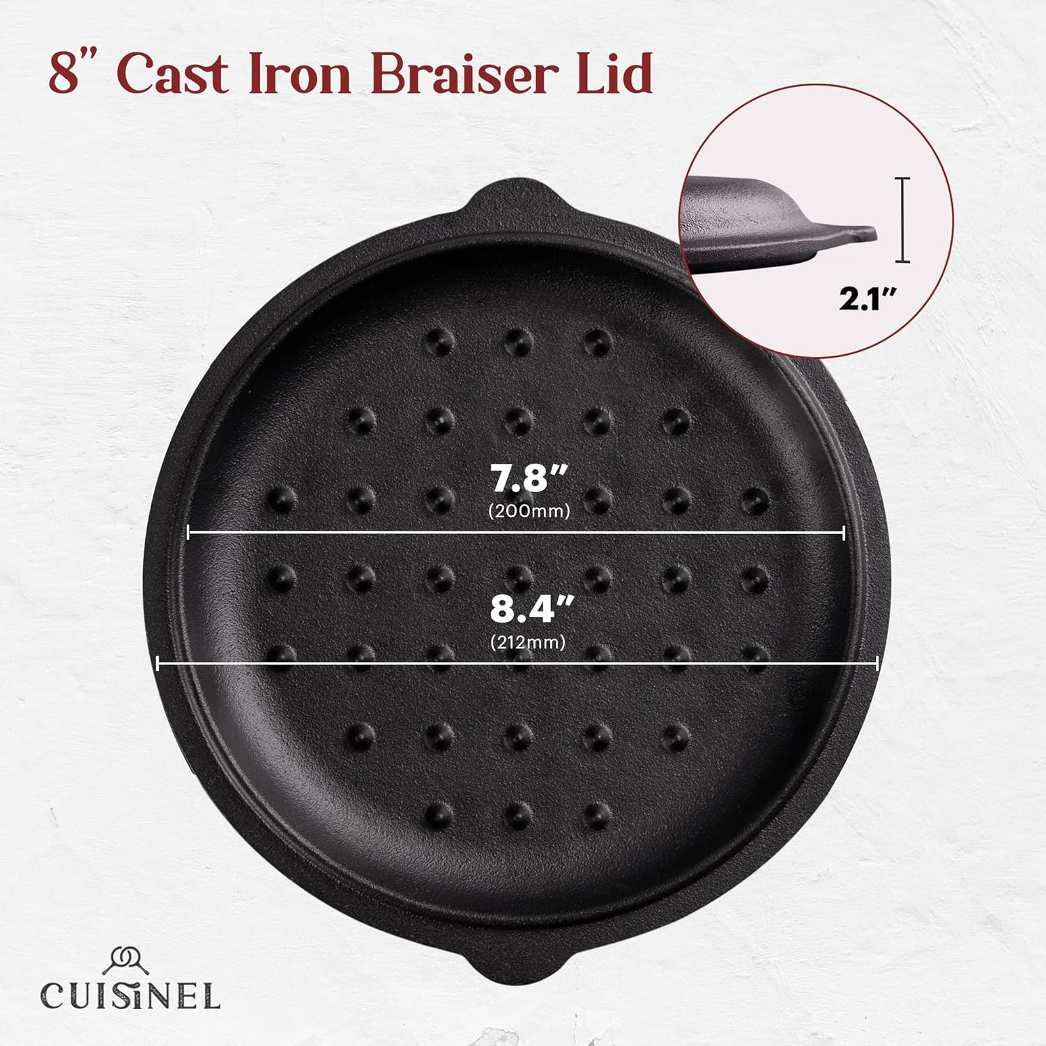 - HEAVY DUTY CAST IRON BRAISER LID – Cuisinel once again revolutionizes the culinary world by introducing a braising cast iron lid to fit most 8"-inch fry pans. With our meticulously placed drip-points in the lid - along with even moisture and heat distribution - you can now truly take your cooking skills to the next level by effectively turning your pan into a casserole or braiser with perfect cooking results. Heavy Duty lid can withstand any temperatures without fear of shattering or cracking.