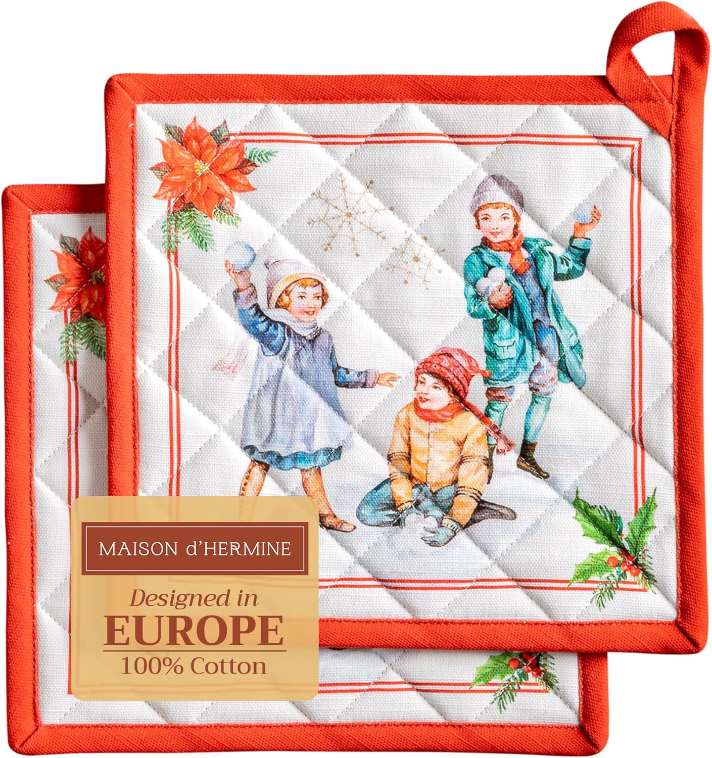 Maison d' Hermine Pot Holders Set 100% Cotton Heat Resistant Potholders 8" x 8" Hot Pads with Loop BBQ, Cooking, Baking, Grilling, Kitchen, Handling Hot Pans (Pack of 2, Chromo)