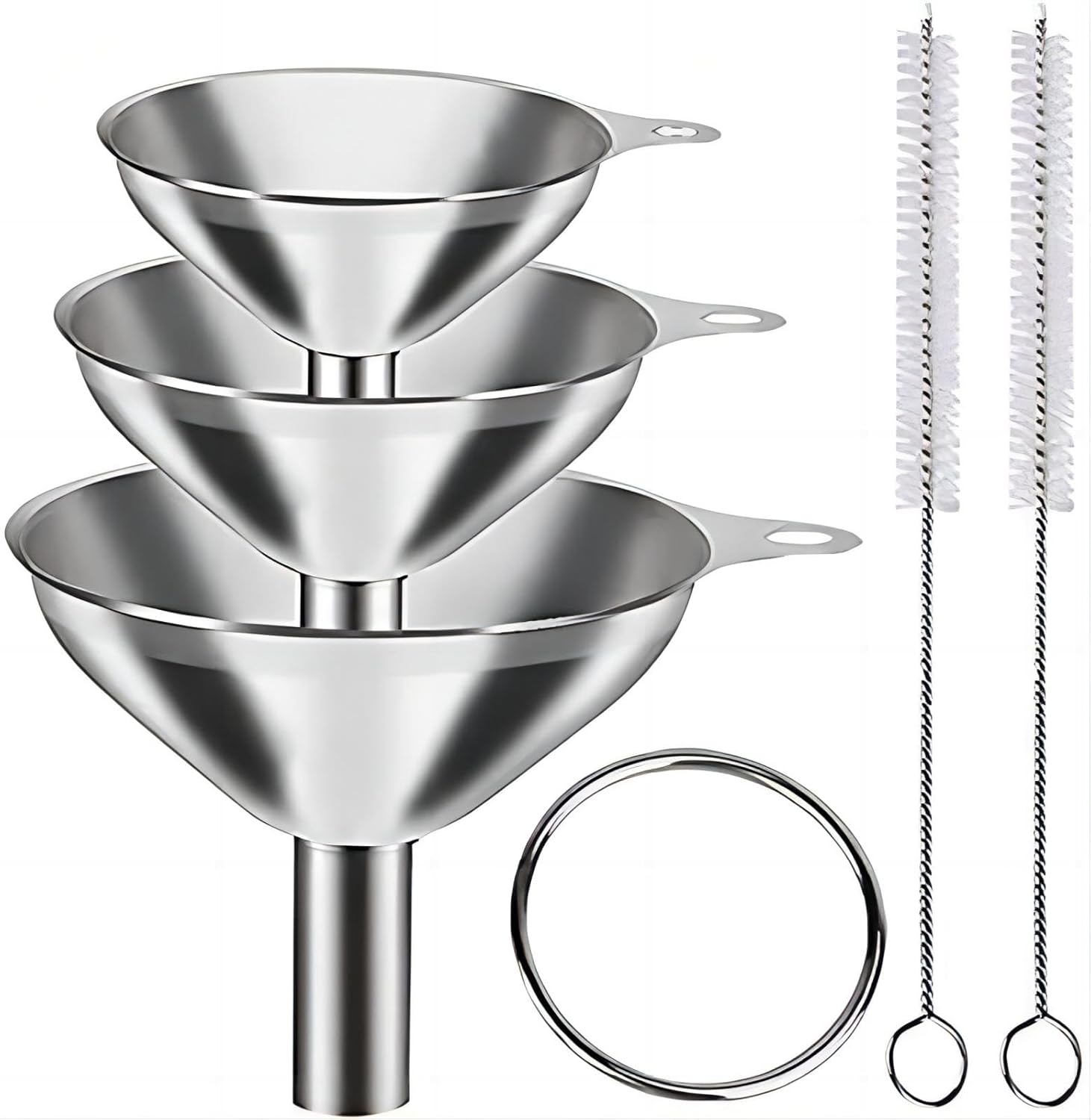 - Easy to Store - The premium stainless steel funnel set comes with a clip-ring that keeps them together for storage. The non-same size makes the kitchen funnels easy to stack up, helps you save the space for your kitchen.