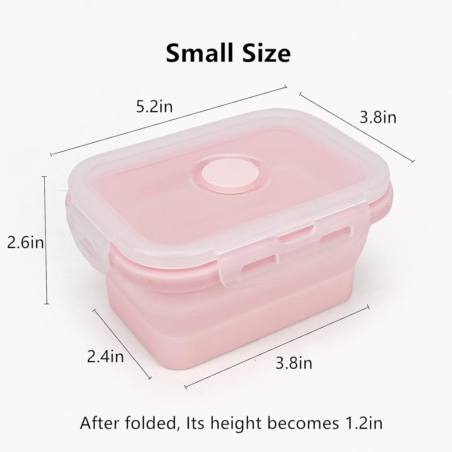 - START YOUR PORTABLE LIFE: Each collapsible food container can hold 350ml(about 12oz) food. In the expanded stage, 5.2inches(L) x 3.8inches(W) x 2.6inches(H); After collapsed, its height becomes 1.2inches. The small food container size makes them fit for storing candies, chocolates, cereals, juices, fruits, nuts, snacks, etc.