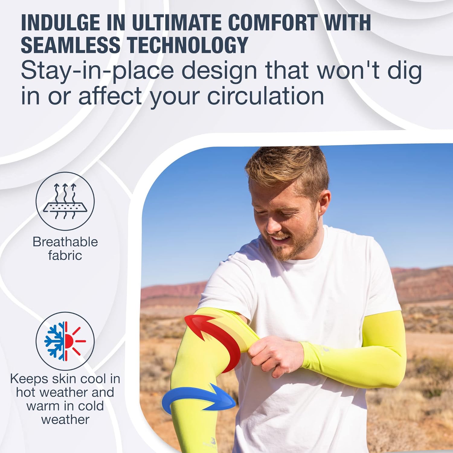 - Superior UPF 50+ premium arm sleeves – our innovative UV sleeves for men and women block over 98% of the sun’s harmful UVA and UVB rays, offering full UPF 50+ coverage. These sun sleeves for men and women are ideal for shielding yourself from the sun on hot days – whether you’re playing golf, basketball, baseball, volleyball, running, or cycling.