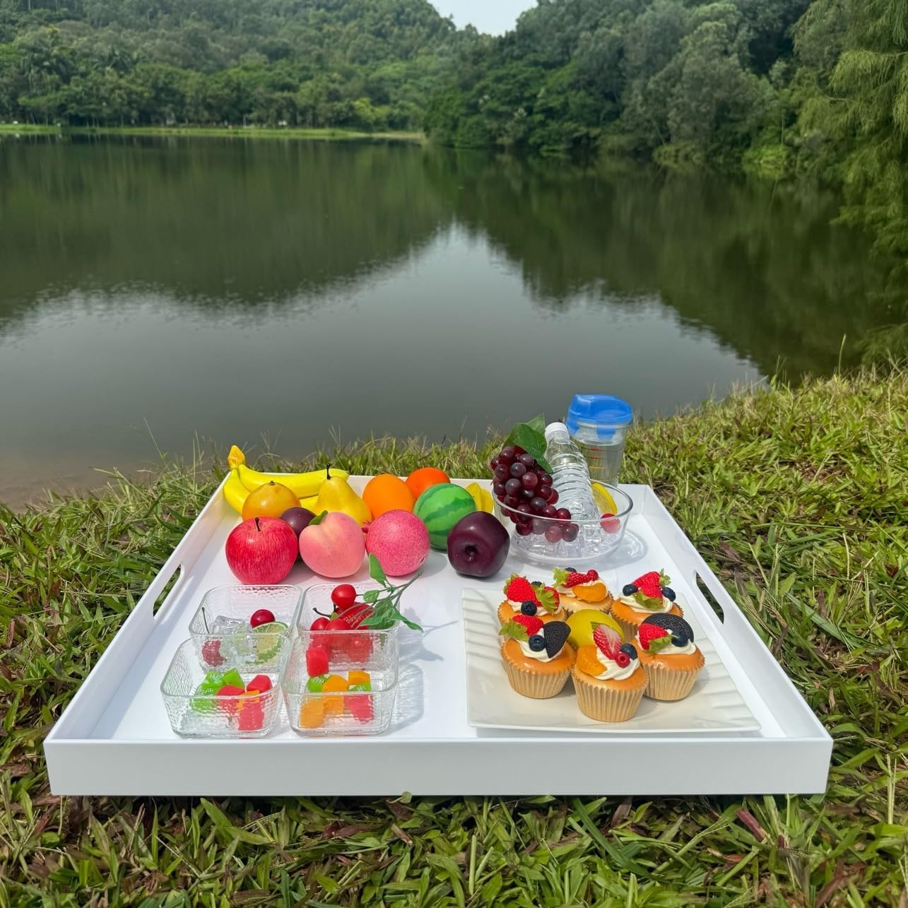 - Multifunctional: Serving tray for serving breakfast, appetizers, coffee, drinks, desserts, snacks, fruit, cheese, food; Decorative organizer tray for cosmetics, jewelry, remote, glasses, ornaments, magazines, Tray can be put on an ottoman, bed, coffee table and couch, It’s elegant to be put on any tabletop or countertop as an accessory